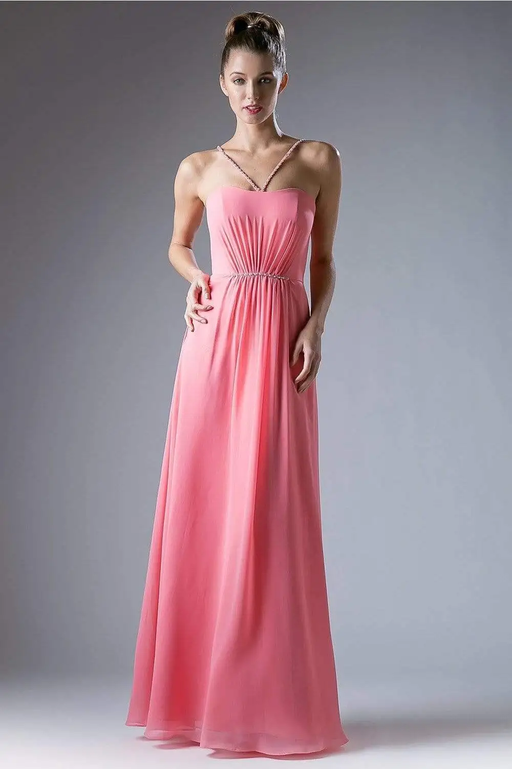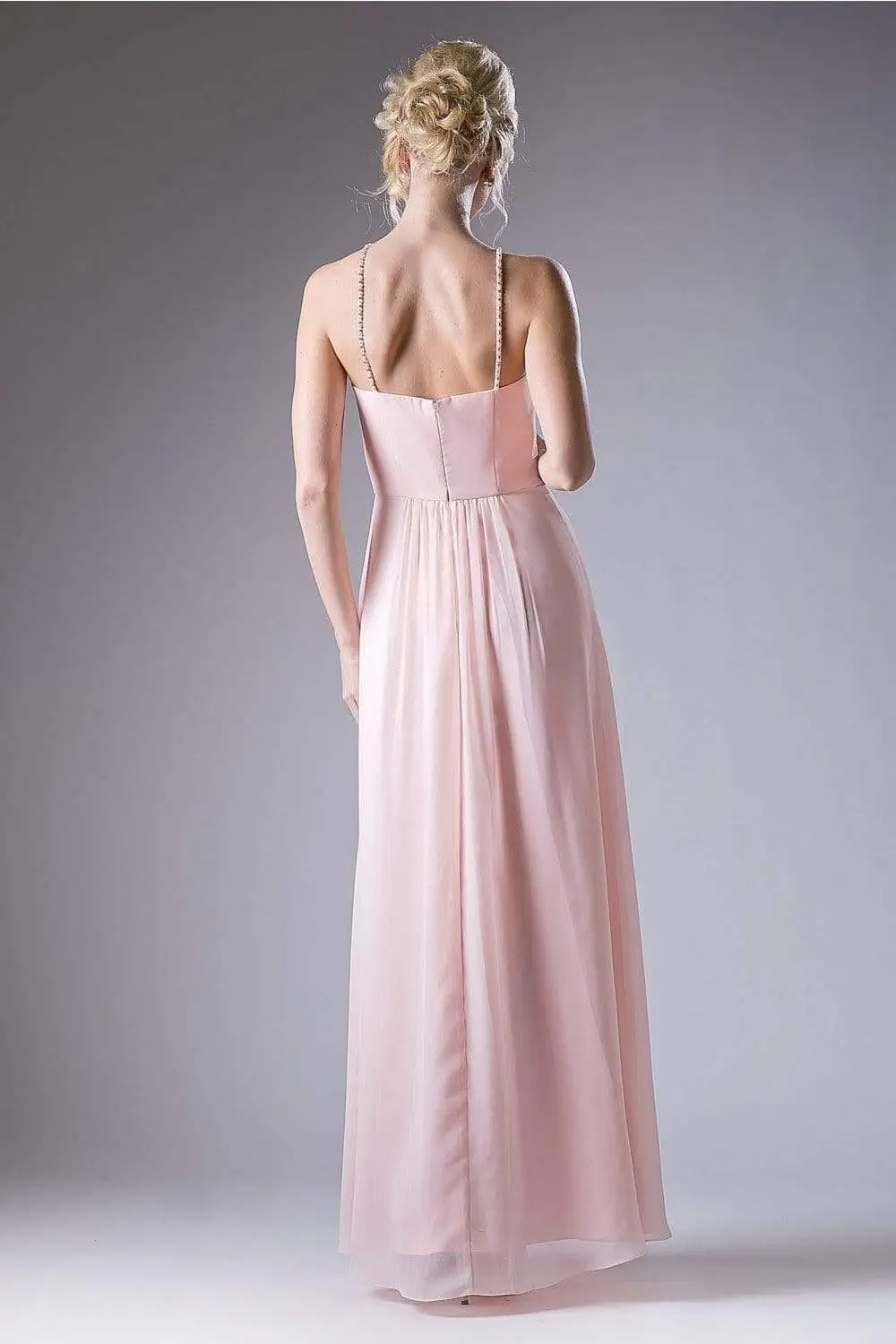 Mesmerize everyone in this charming soft chiffon gown by Cinderella Divine CJ249. A sleeveless A-line dress with a modified sweetheart neckline and beaded embellished spaghetti straps. Sheered details gather on the natural waistline and lined with jewel beads. The skirt elegantly flows with subtle flare down the floor length hem. Offered in various soft pastels and bright colors, the dress is suitable for bridesmaids, wedding guests and formal events. Be simply pretty wearing Cinderella Divine that is sure to make you the darling of the party!