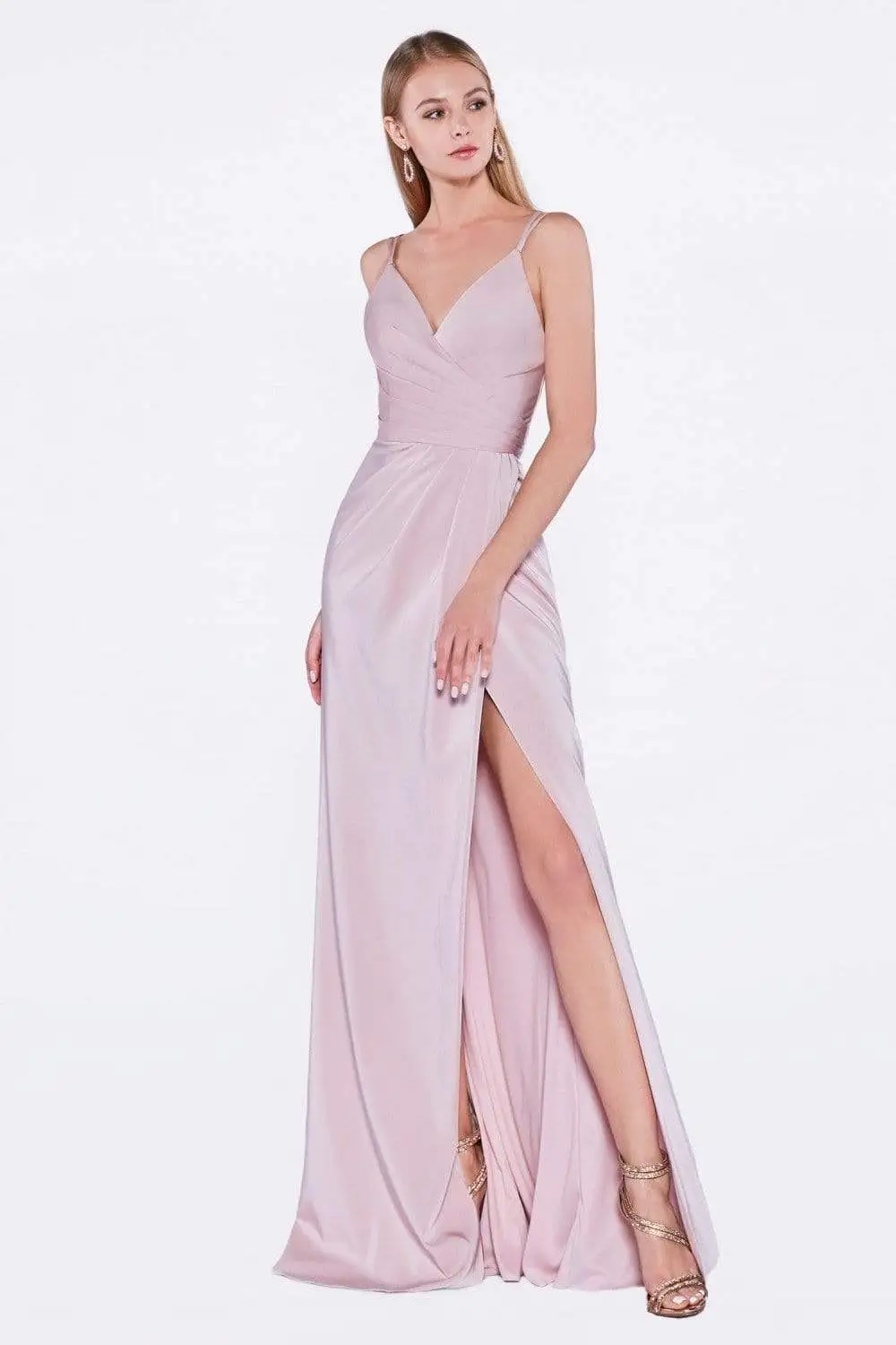 Flaunt a stylish sophistication that is reminiscent of the timeless glamour of the tinsel town in this Cinderella Divine KC1850 creation. Flourishing radiating pleats along a wrapped bodice, this gorgeous piece showcases a v-neckline supported by dual spaghetti straps that meet on a low open back. Beautifully cinched along the natural waist with fine draping, the sheath skirt parts alluringly with a stunning high slit before rushing down to a full-length hem and a sweeping train. Look oh so exquisite as you charm them all night long in this Cinderella Divine masterpiece. Model is wearing Red color.