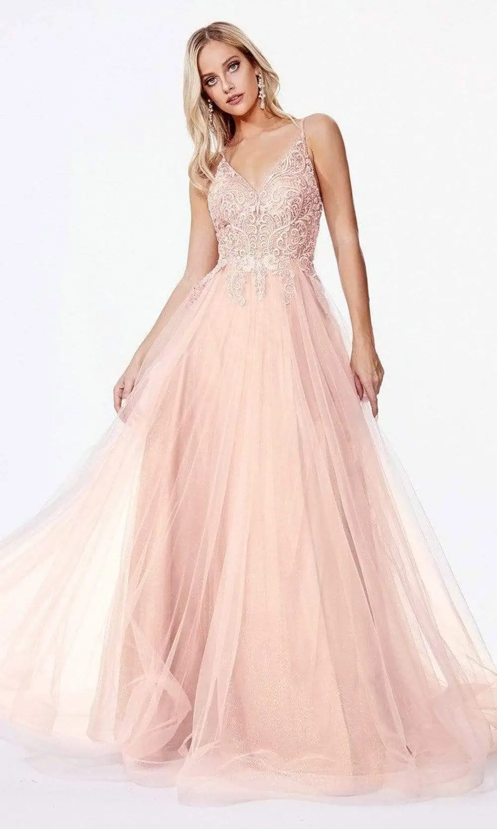 Be the center of attention in this glamorous Cinderella Divine KC897. This long dress features embroidered lace on a fitted bodice matched to a long A-line silhouette. The skirt is made with layered tulle that has a thigh-high sheer slit and sweep train. You are a breath of fresh air in this dreamy Cinderella Divine.