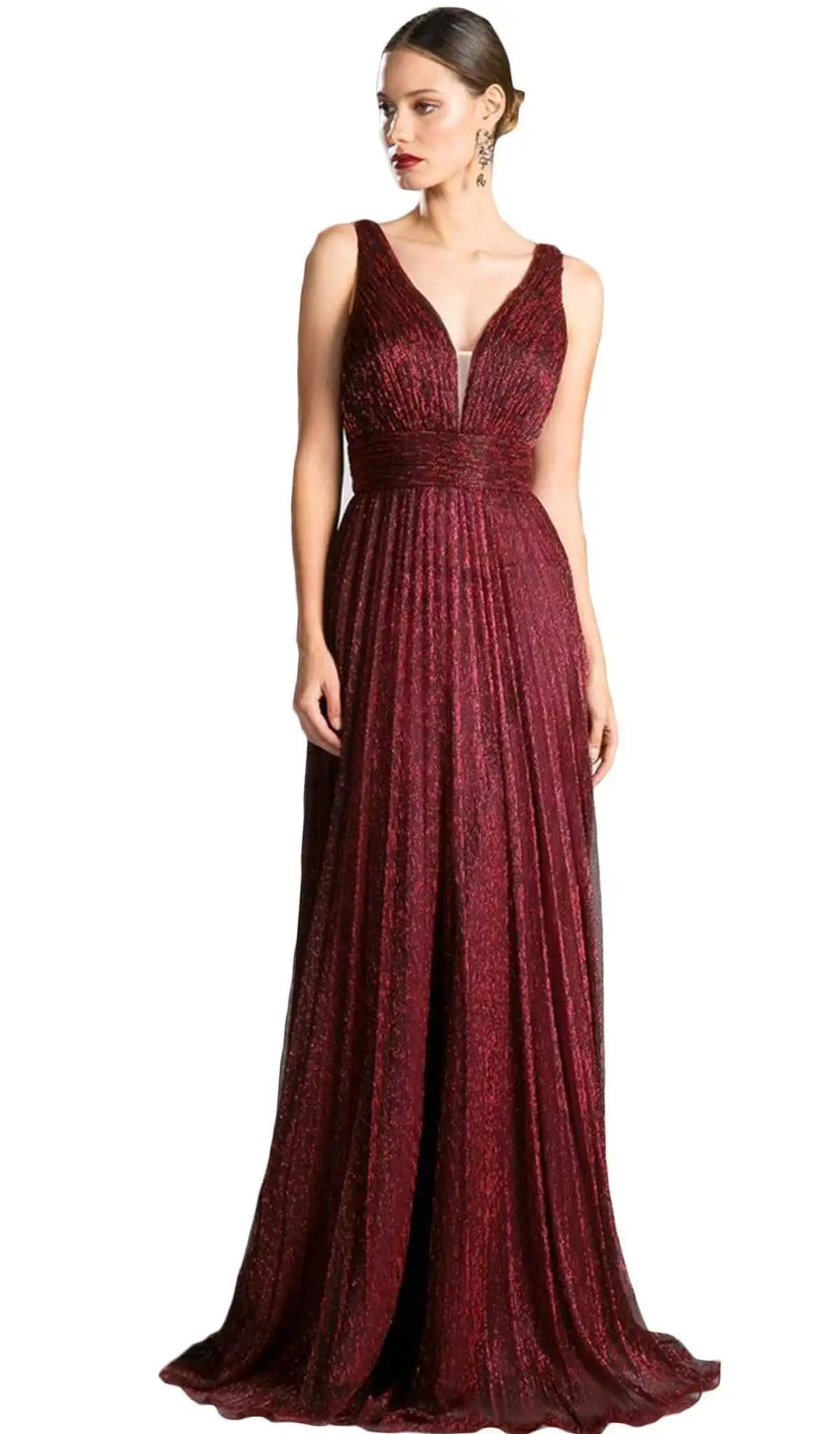 Embody the essence of radiant beauty when you don this exquisite Cinderella Divine UT261 creation. Exceptionally embellished with fine shirred rendering all throughout its silhouette, this refined piece flaunts a plunging v-neckline with an overlaying illusion modesty inset. Designed with a v-cut open back, this ensemble is embraced around the midriff with a pleated band for that cinching effect. The A-line skirt fabulously streams with intricate creasing as it traverses down to the floor to create a glimmering sweep of train. Models are wearing the Burgundy, Royal and Sage colors.
