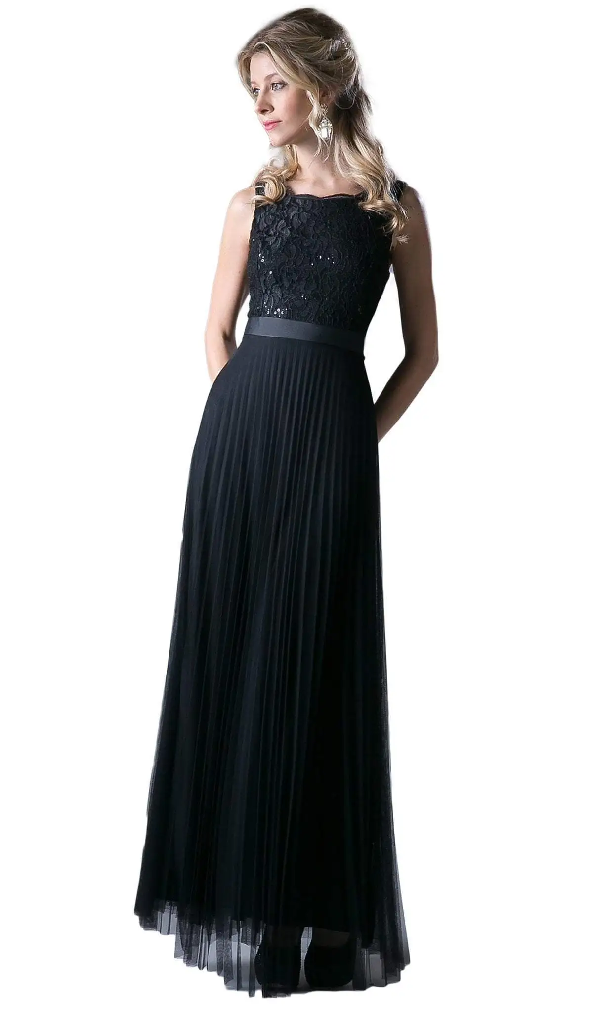 Be beautiful in this fashionable evening dress by Cinderella Divine A1615. Features a sleeveless, scalloped bateau neckline with bodice decked with sequined lace. The waist is accented with a ribbon tie waist and opens a full length pleated A-line skirt. Be ready to capture the spirit of that romantic evening in Cinderella Divine.