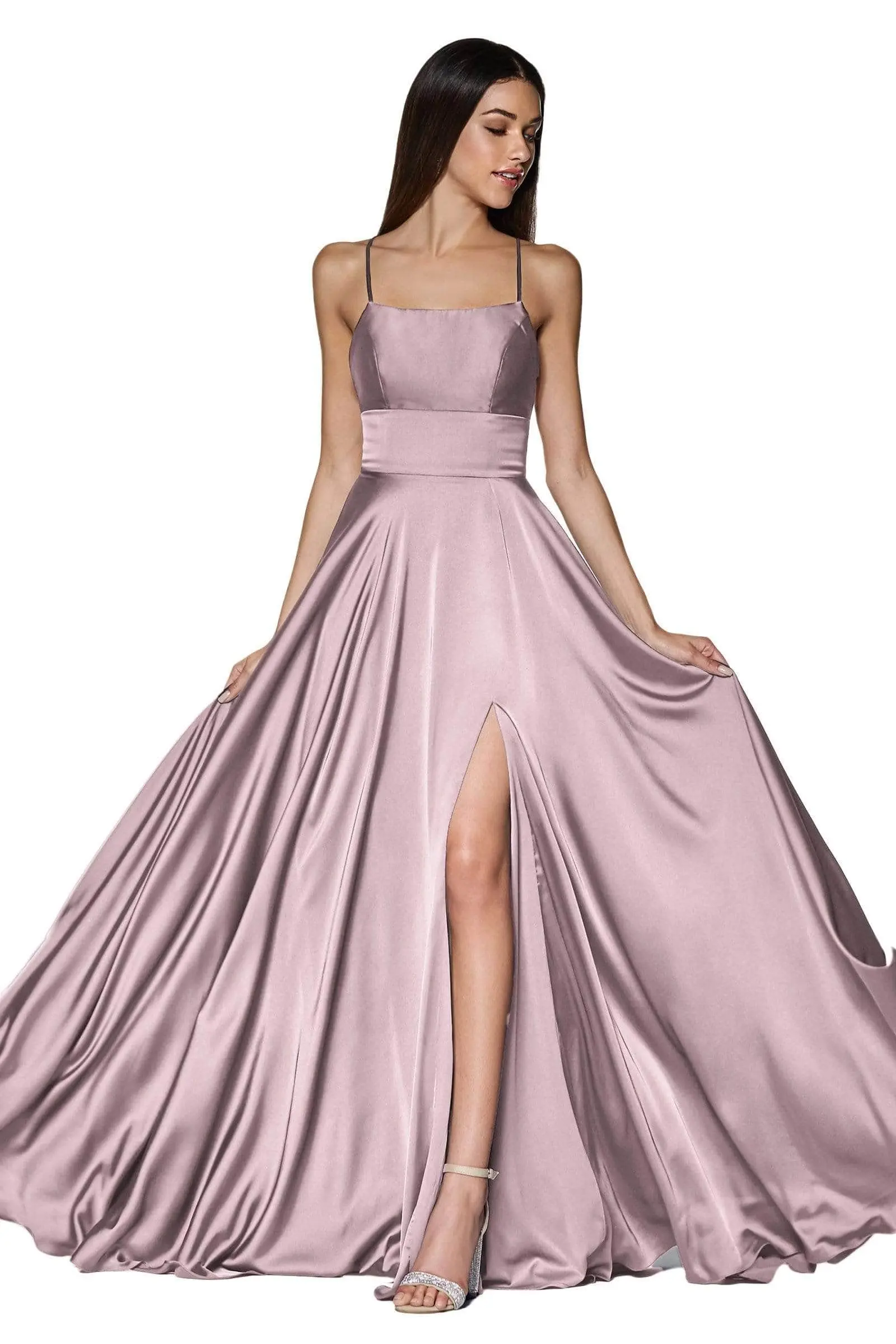 Defined with a sleeveless bodice stringed with spaghetti straps, this dress is made with a straight-across neckline on lavish satin. An empire waistband embraces the midriff. Crisscrossing at the back along with a tie design, the A-line skirt opens up with a sexy slit as it cascades down into a trailing train. Model is wearing the Dusty Rose color.