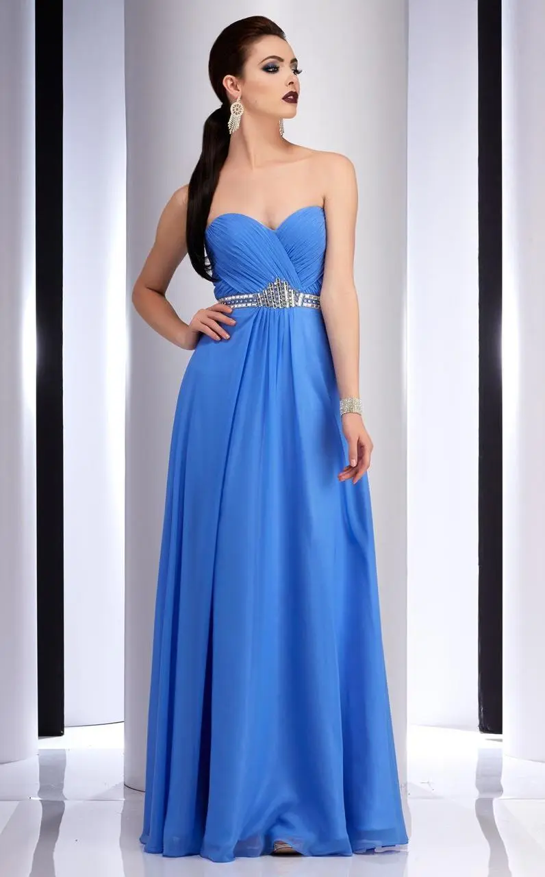 Show off your classy style when you wear this creation by Clarisse 2827. This strapless dress has a sweetheart bodice shape with fine ruching at the bust and back. Jewel accent wrap the waist for that elegance needed. The skirt has soft movement with sheer overlay and finishes with a full length hem. Make it a romantic occasion with this dress by Clarisse.