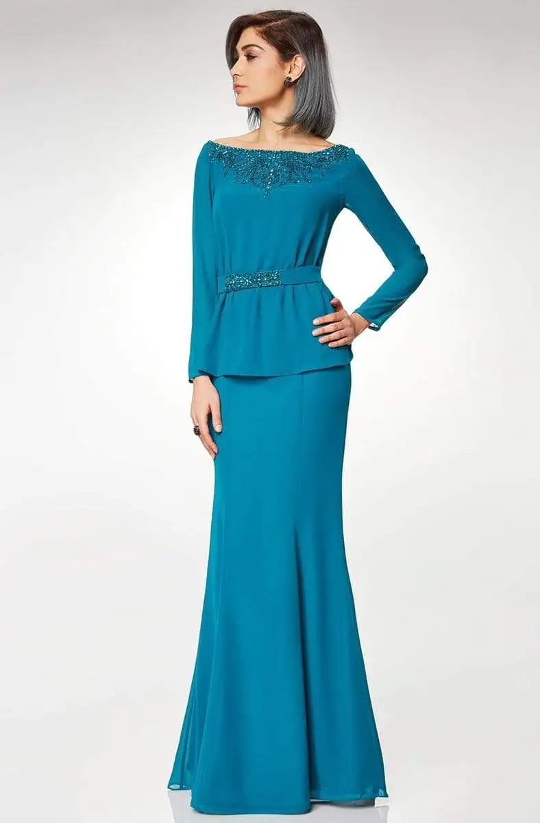 Walk in a defined sophistication and beauty wearing this long formal dress by Clarisse M6538. Crafted in elegant chiffon fabric, this sophisticated formal occasion dress is embellished with hand crafted beadwork forming a bejeweled bateau neckline. The dress features slightly sheered long sleeves and detachable self-fabric beaded embellished belt that you can opt into whether you want a classy loose feel or with peplum effect from a cinched waist. The skirt skims you hips and flares from the knee down to the floor length hem. The perfect details of this long dress by Clarisse make it the best choice for formal gathering or wedding, especially fitting for the mother of the bride.