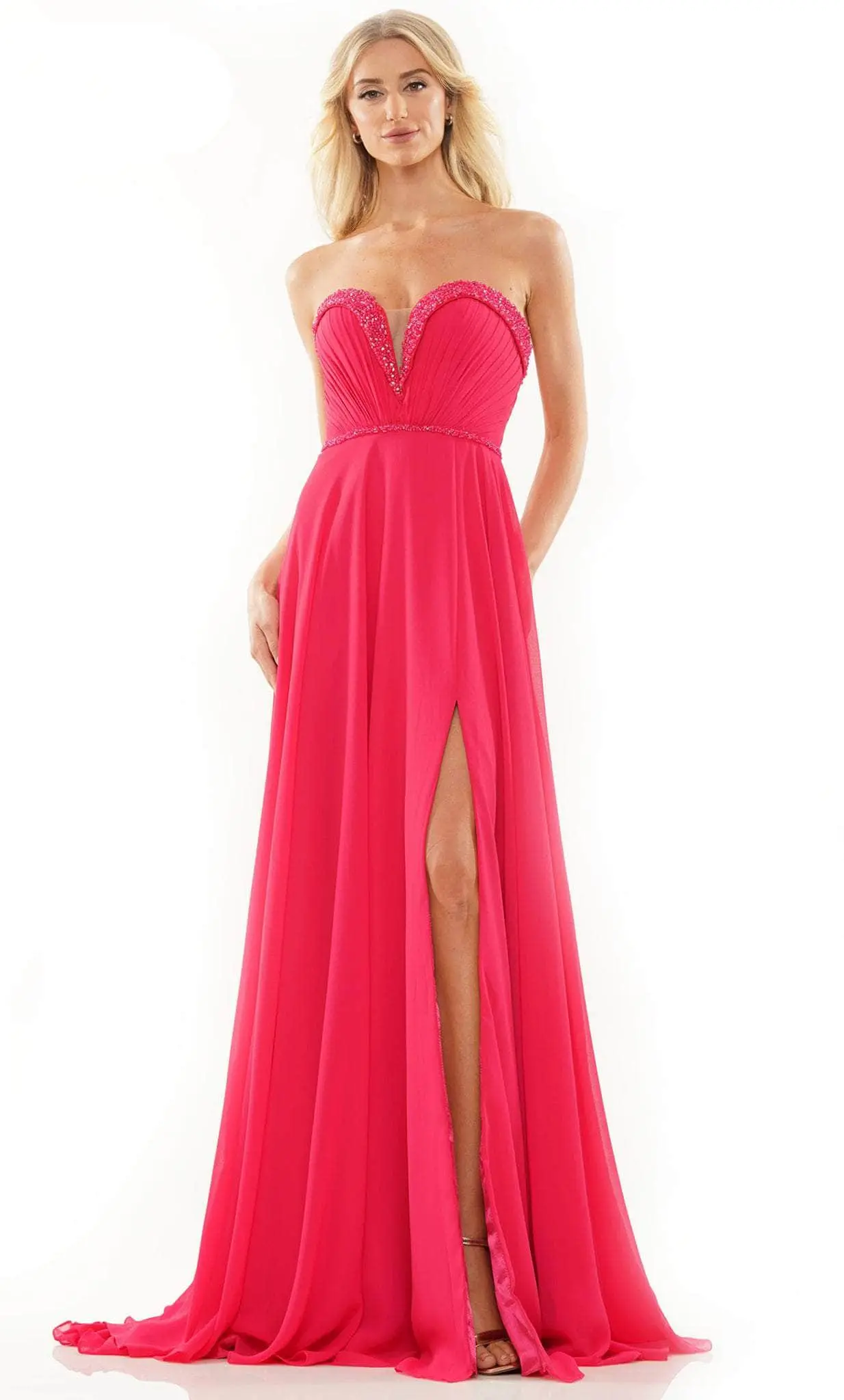 Walk in a defined sophistication and beauty wearing this Colors Dress 2893 creation. Styled with pleated details in the bodice, this winning piece will be an attention grabber as it showcases a strapless bodice crowned with a plunging V-neckline accented with a sheer insert. The full-length skirt is accentuated with a side slit and parades in an A-line silhouette with a subtle train finish. The bust area is adorned with bead embellishments. In this Colors Dress 2893 masterpiece, orchestrate your moment to stand out. Models are wearing Navy, Turquoise, and Watermelon colors.