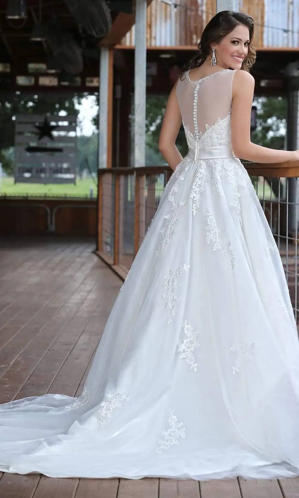 | Details: | Sleeveless, Jewel beads, Sheer back, Illusion, Waist band, Embroidery, Fit and Flare, Button-back, Court Train |