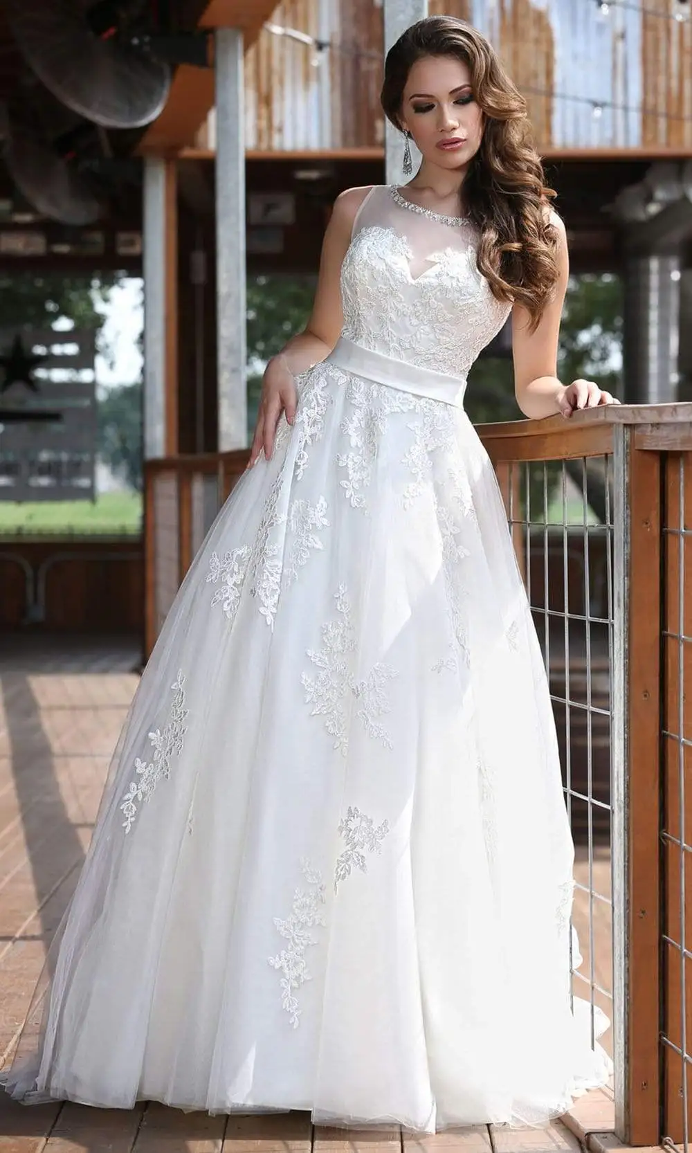 Da Vinci Bridal 50291 wedding dress is perfect for any traditional affair or contemporary celebration. Dress is made with lace and tulle in a ballgown silhouette while it features illusion neckline embellished with jewel beads. It is styled with sheer back and covered with buttons. A thick waistband is put around natural waist and dress is designed with embroidery that flows in a court train. Da Vinci Bridal allowing both petite and curvy brides the chance to wear this exquisite look.