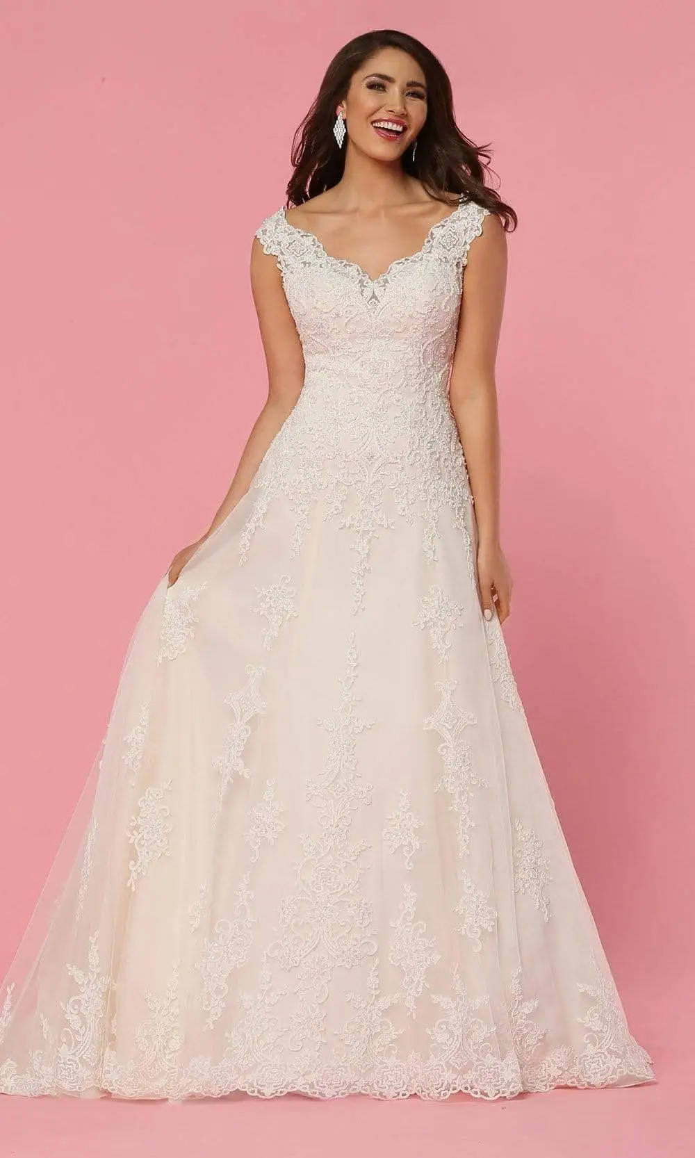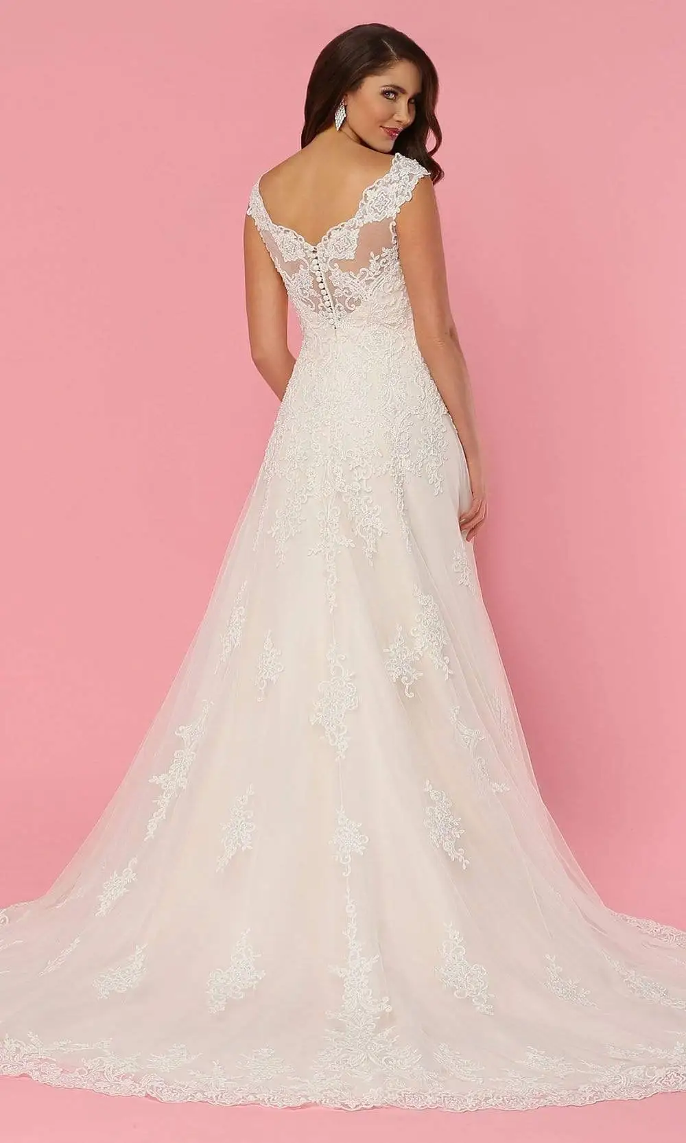 Look absolutely breathtaking in Da Vinci Bridal 50444 bridal dress. The fitted bodice is embroidered for a lacy effect with scattered sparling beadings, framed with V neckline and features a cut away shoulders supported with wide lace straps. The back of the dress is equally fascinating with its semi-sheer V shaped style, with bridal themed covered buttons to lock the bodice together. The skirt parades a full-length A-line silhouette beautifully designed with scallop trim hem and finishes with a sweep train for added drama. Da Vinci Bridal wedding dress boasts undeniable fascination in a chic silhouette for stylish Brides.