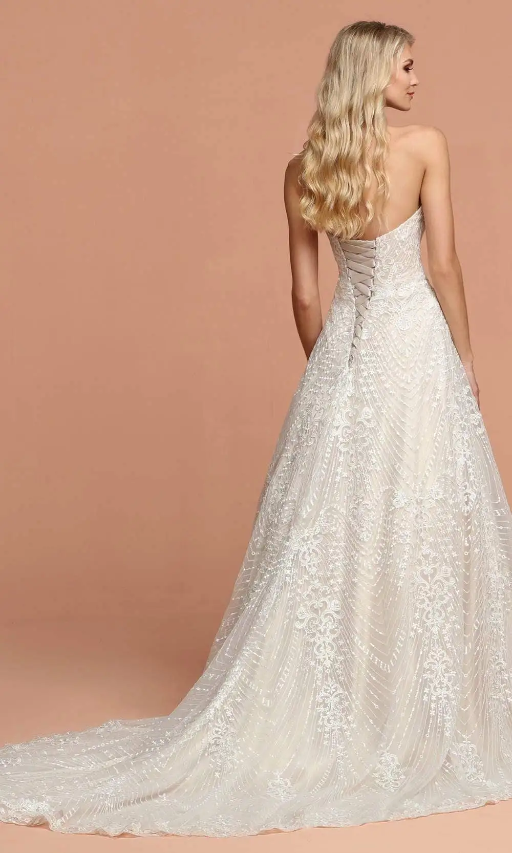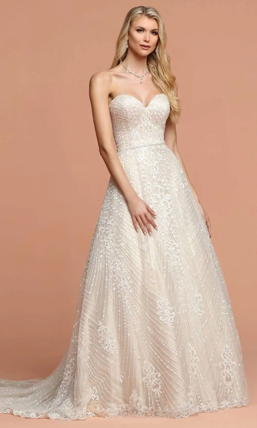 Fascinate him as you walk down the aisle wearing this exceptional Da Vinci Bridal 50593 masterpiece. This lace ensemble features a strapless, sweetheart neckline with a lace up back for an adjustable fit. The skirt is tailored in a floor-length A-line silhouette and finishes in a chapel train. This Da Vinci Bridal look is making it well-suited for both petite and curvy brides who want a chic, classic look. Find more White Dresses.