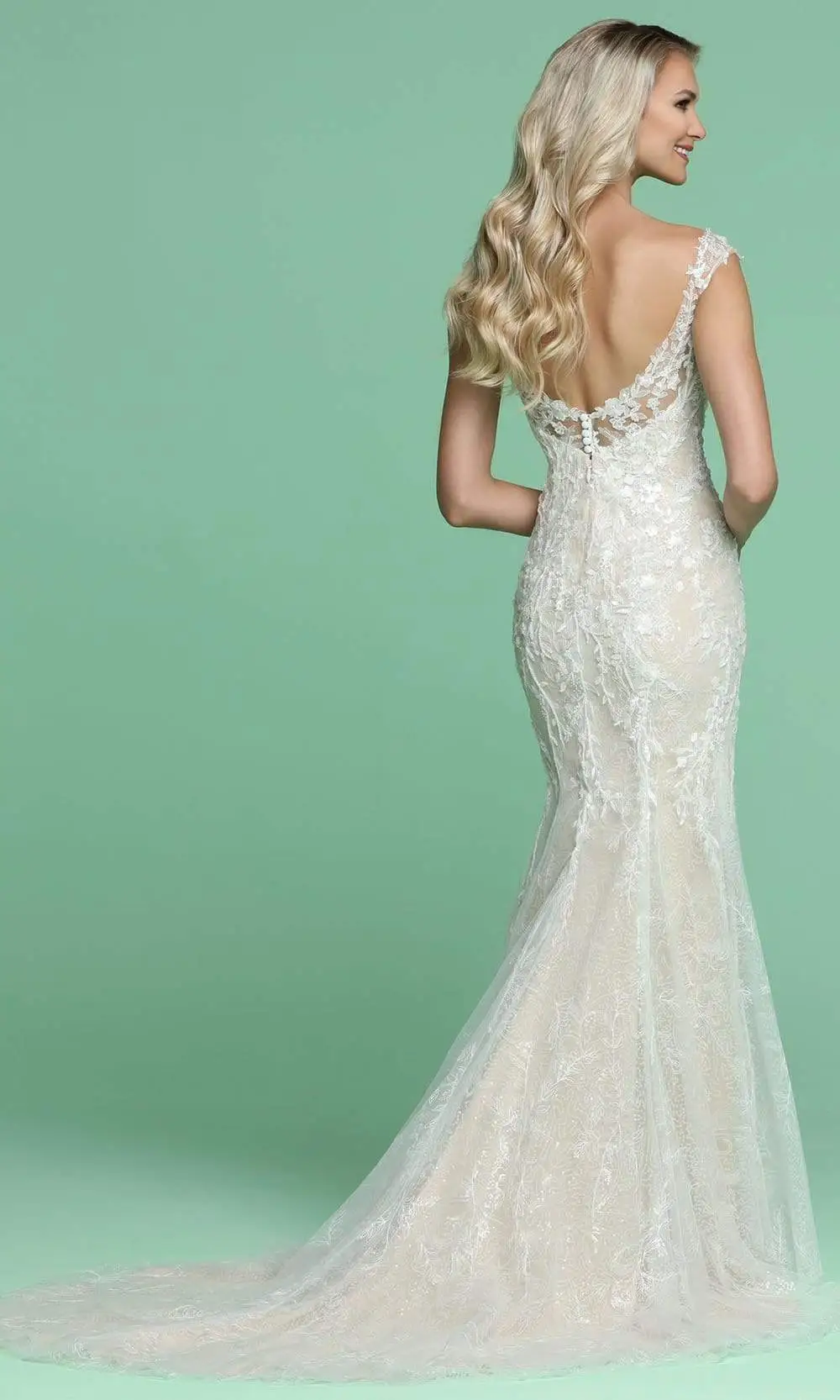 Make a grand entrance and glow with charm on your wedding day in this Da Vinci Bridal 50602 creation. Accented with an intricate embroidered lace silhouette, the gown features a sweetheart neckline and sheer cap sleeves. The back has a sheer scoop back and fabric button closure. The mermaid skirt skims and flares into a tulle train. Glow with beauty on your wedding day in this Da Vinci Bridal masterpiece.