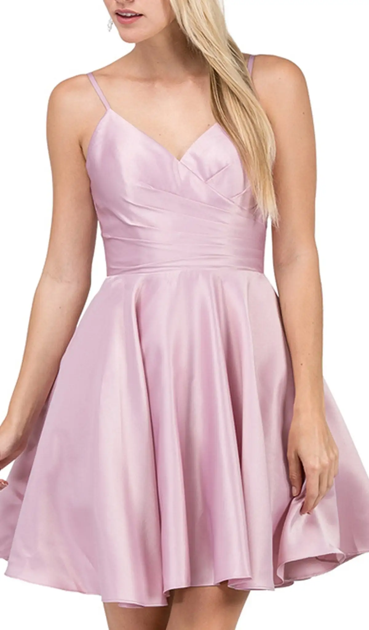 | Details: | Spaghetti Straps, Pleated Surplice Bodice, Square Cut Back, Back Zipper Closure, Inseam Pockets, Short Hem |