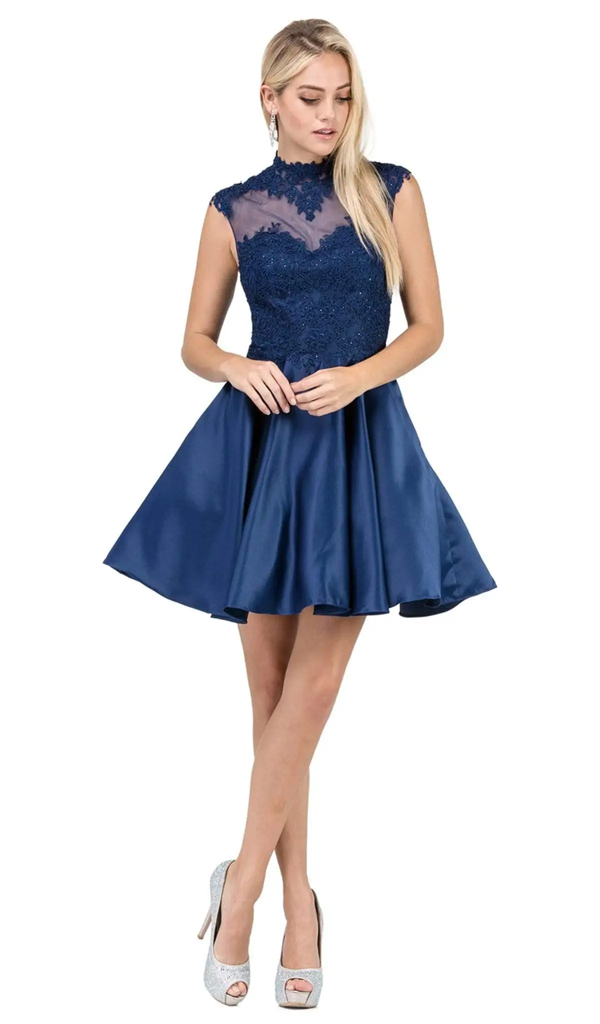 Make waves while captivating everyone with your exquisite taste in this Dancing Queen 3069 creation. Festooned with a lace appliqued bodice sprinkled with tiny rhinestones from the cap sleeves to its bodice, this exquisite piece shows an adorned high illusion over a sweetheart neckline. Designed with an ornate illusion full back, the lush A-line skirt flutters magnificently to a short hemline. Be at the front and center of the crowd’s radar in this Dancing Queen masterpiece. Models are wearing the Burgundy, Neutral and Navy colors.