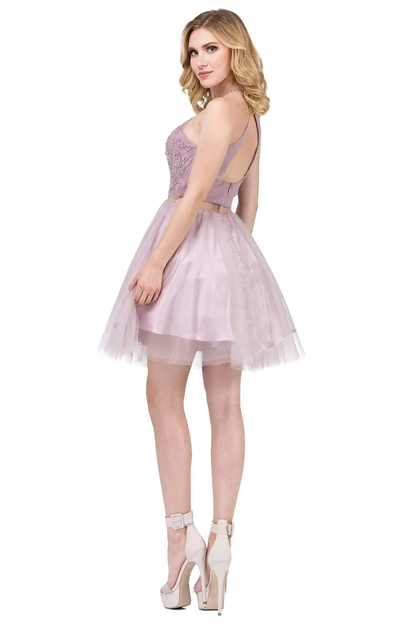 Charm the all as you don this glamorous piece by Dancing Queen 3087. The gorgeous homecoming ensemble showcases glittering bead and sequin embellishments at the fitted bodice framed with a halter neckline. Sheer fabric exposes the solid sweetheart lining for a seductively touch, the racerback reveals a bold teardrop-shaped cut out for added allure. Sparkling scalloped patterns trim the sheer waistline as it leads to the a-line skirt designed in tulle over the hips with a satin lining. Have all eyes on you in this Dancing Queen dress. Model is wearing Mocha color.