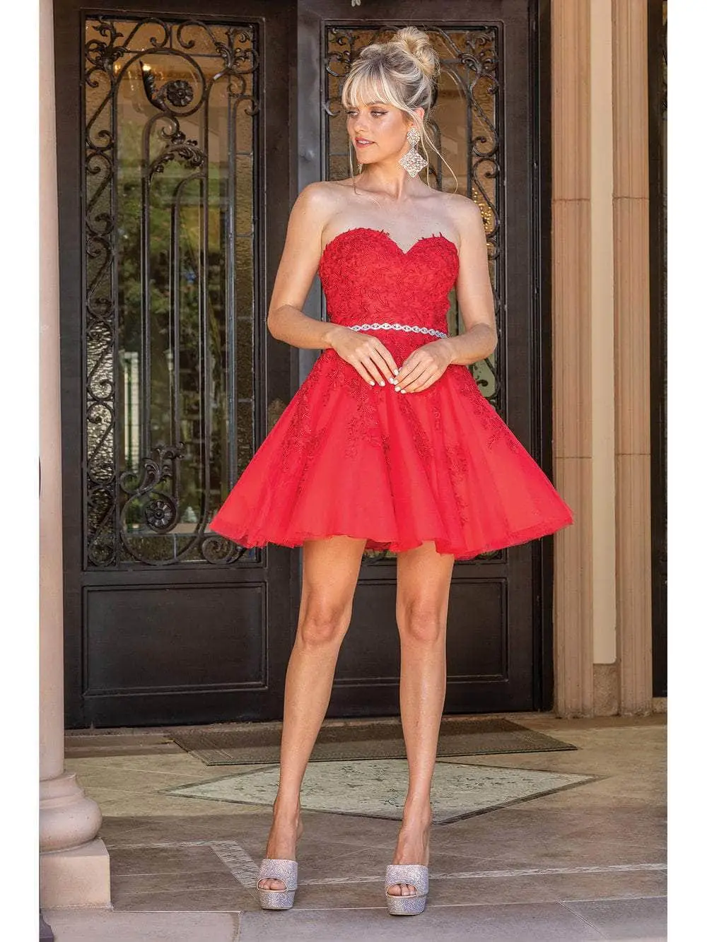 You will be an enchanting beauty as you wear this Dancing Queen 3271 cocktail dress. This dress highlights a sweetheart neckline in a fitted and appliqued bodice. The skirt reveals an A-line silhouette down to its mid-thigh length while the back shows a mid-open back with back zipper closure. Be fabulous in this Dancing Queen creation.