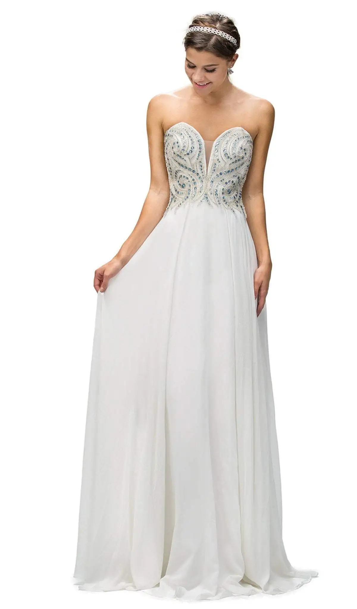 The dress boasts a strapless, sweetheart neckline with sheer fabric in the middle. The bodice is fully decorated in swirl patterned beads. The skirt flows into an A-line silhouette. Be ready to mesmerize the night in this evening gown.