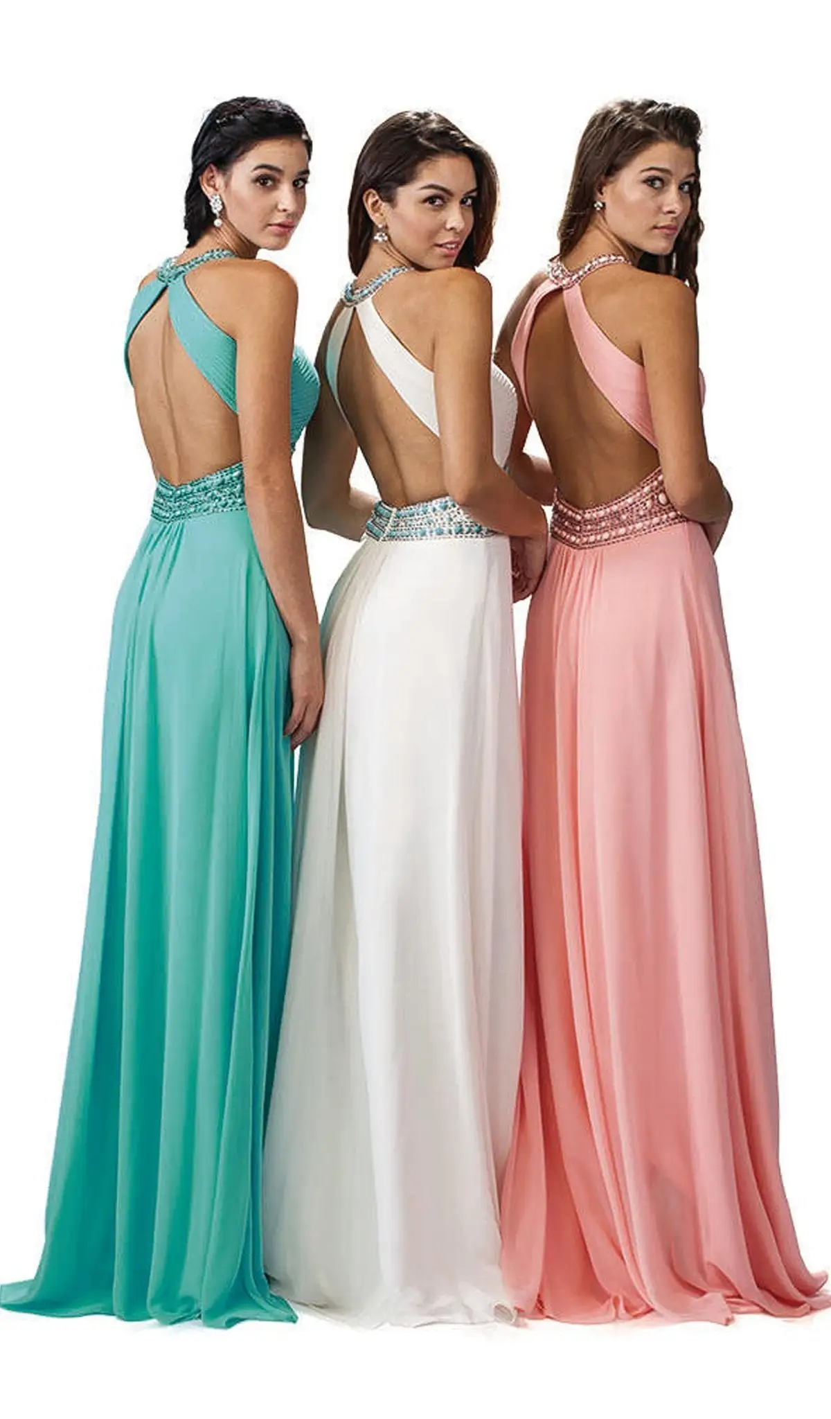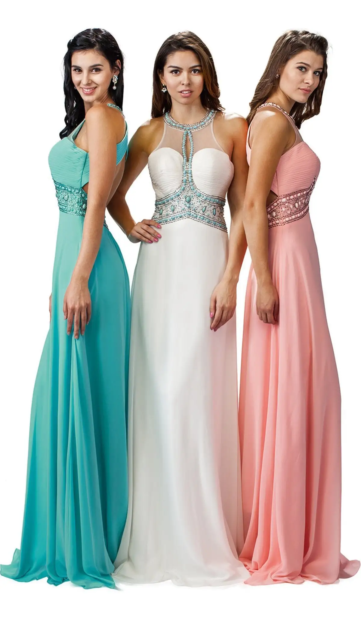 Stand out and wow them all in this wonderfully fashioned long evening gown. Vibrantly colored beadings pave the necklace illusion collar and splits down on the finely ruched sweetheart bodice. Triangle cutouts provide sensuous back detail. The inverted basque empire waist gives way to a long, flowing skirt. This long gown is designed to bring you that stunning look for that next special evening event!