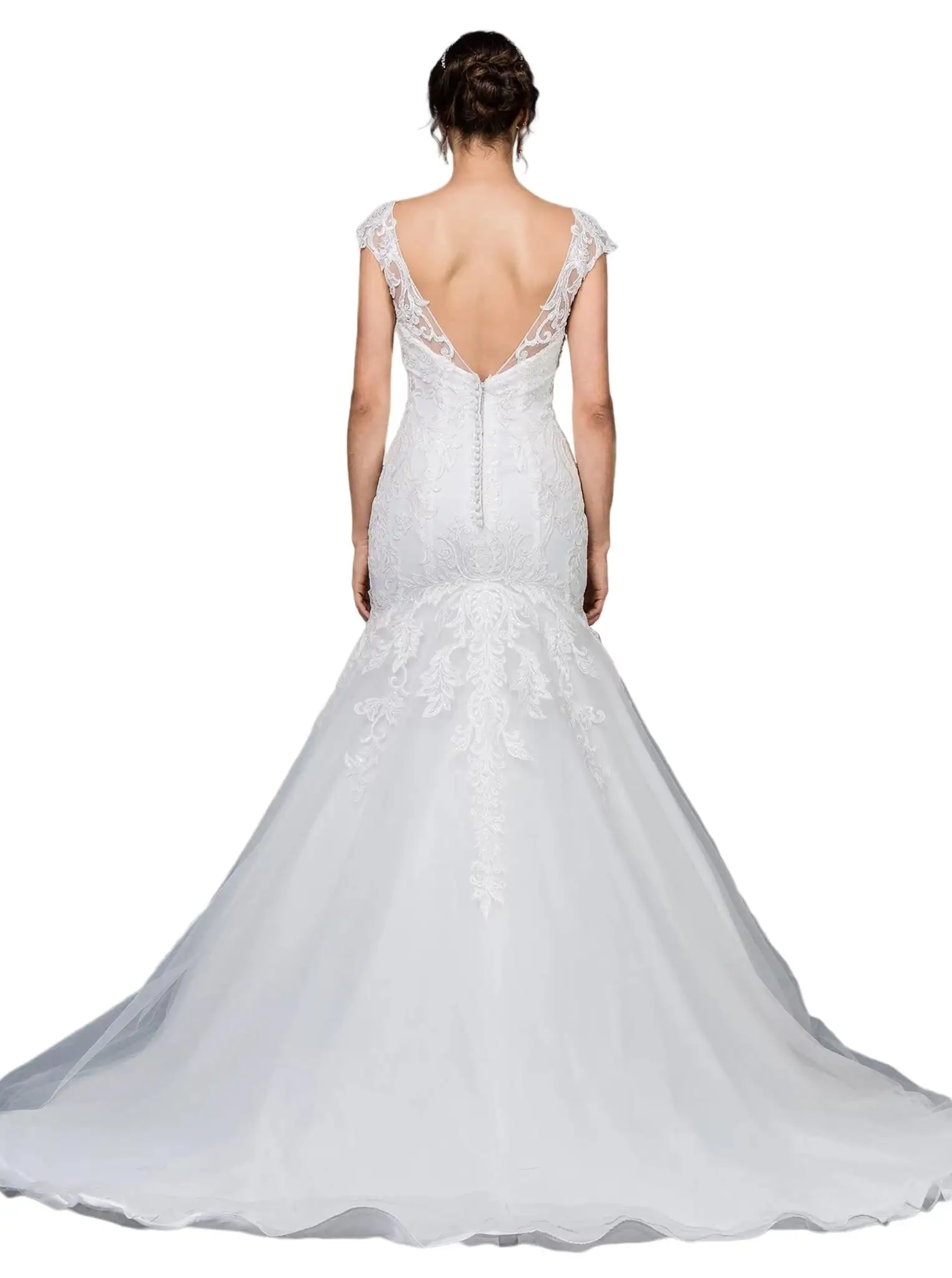 | Details: | Cap sleeves, Lace appliques, Sweetheart lining, Fitted bodice, Trumpet skirt, Low V-back, Covered buttons, Trumpet skirt, Sweep train |