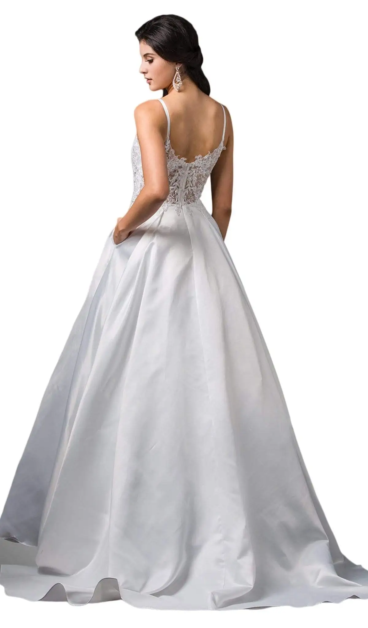Walk the red carpet in style wearing this stunning gown from Dancing Queen 0081. Enchants in a sleeveless, V-neckline with fitted bodice ornate with appliques and spaghetti straps. The skirt opens in a full length A-line skirt with a sweep train finish. Shimmer and shine in an ethereal gown from Dancing Queen.