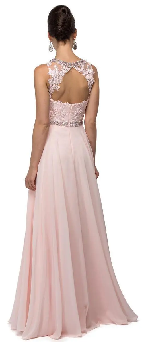 Completely take everyone’s breath away in this stunningly delicate long dress. Adorned with rhinestone-topped lace appliques on the sheer bodice, the stunning party dress showcases a beaded bateau illusion over a sweetheart neckline and an open back with a triangular cutout. Trimmed with a sparkling band of stones, the chiffon A-line skirt pleats as it flows down to a full-length hem. Always make a dazzling impression at prom or your special occasion in this dreamy gala dress.