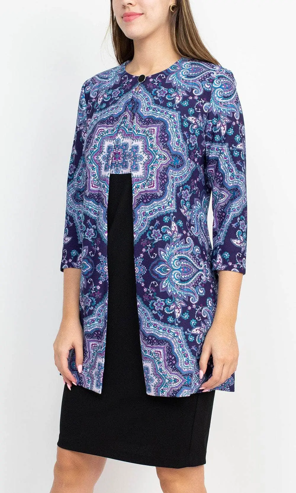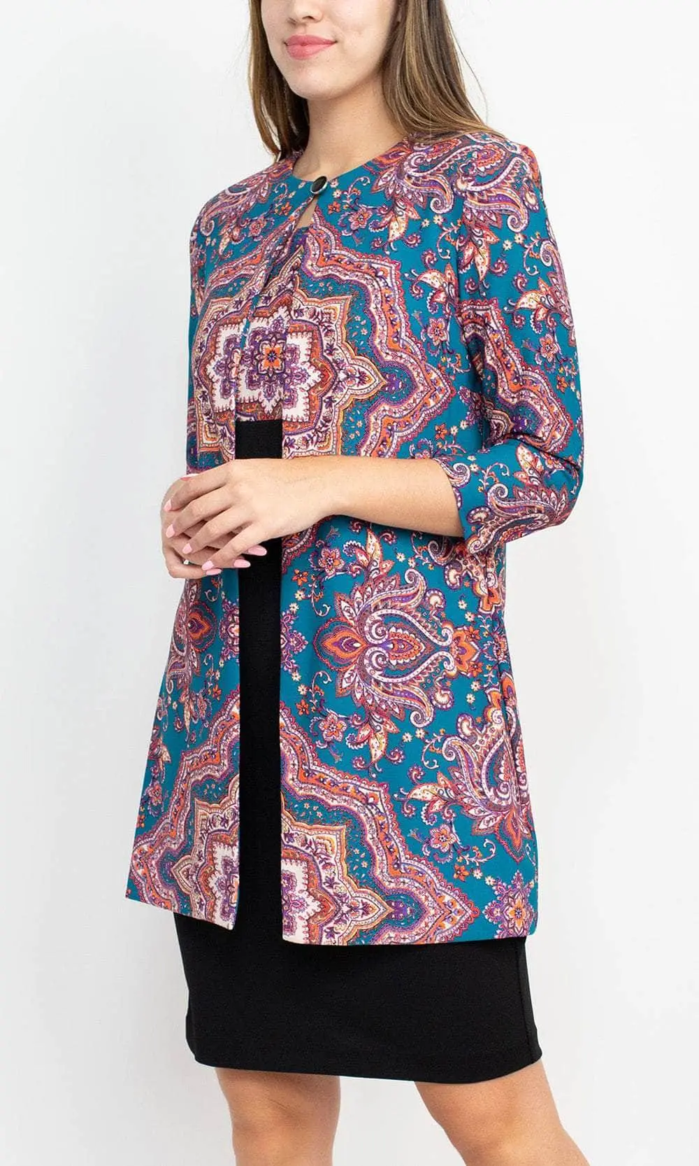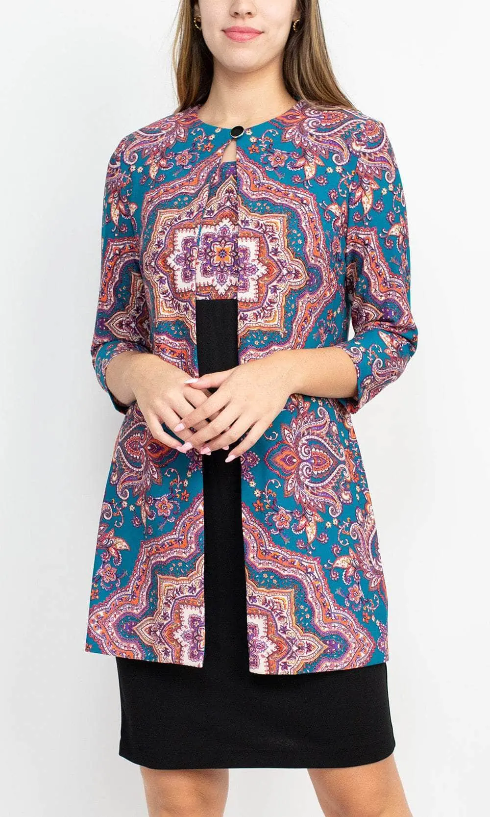 Stand out and shine when you grace as you flaunt style in this Danny & Nicole 27138M creation. Crafted with a sleeveless bodice, this impeccable piece shows off a scoop neckline and a slim-sculpted empire waist. Charmingly printed with vibrant patterns, the sheath skirt sculpts into a knee length hemline. A matching long sleeve open jacket completes this ensemble. Dial up your stylish appeal when you don this chic Danny & Nicole masterpiece. Models are wearing the Black Eggplant and Black Teal colors.
