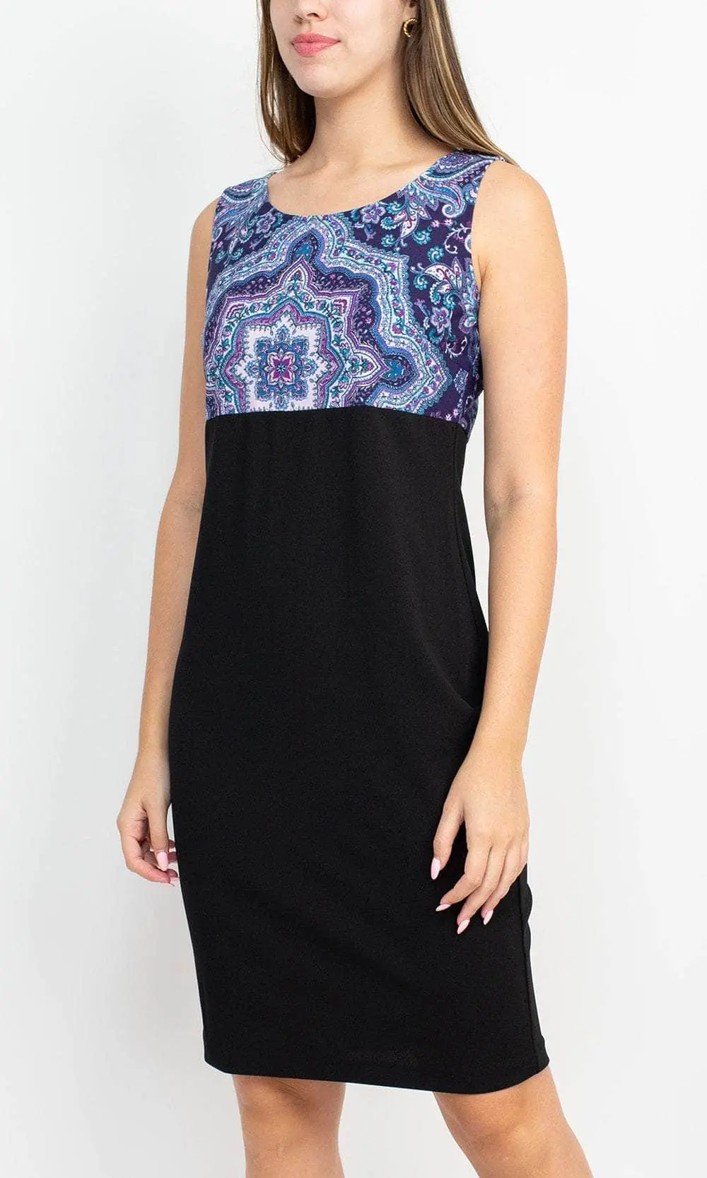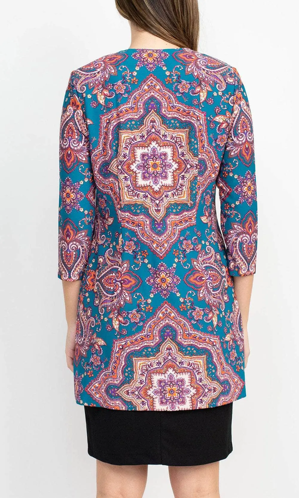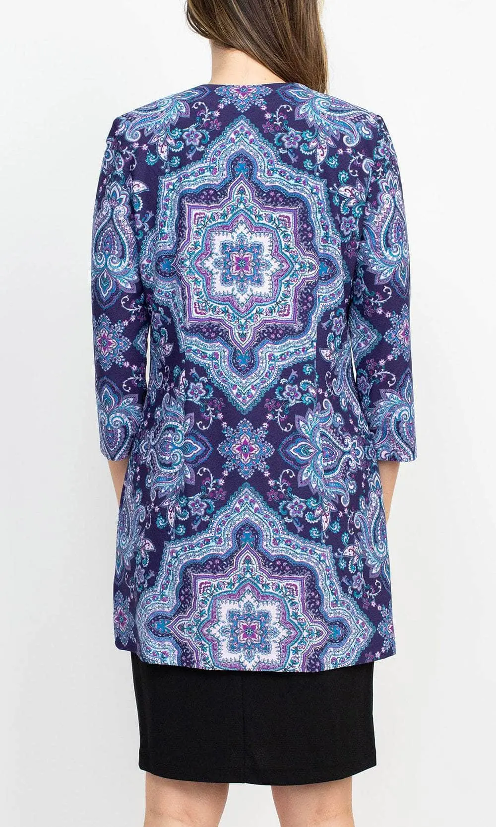 Stand out and shine when you grace as you flaunt style in this Danny & Nicole 27138M creation. Crafted with a sleeveless bodice, this impeccable piece shows off a scoop neckline and a slim-sculpted empire waist. Charmingly printed with vibrant patterns, the sheath skirt sculpts into a knee length hemline. A matching long sleeve open jacket completes this ensemble. Dial up your stylish appeal when you don this chic Danny & Nicole masterpiece. Models are wearing the Black Eggplant and Black Teal colors.
