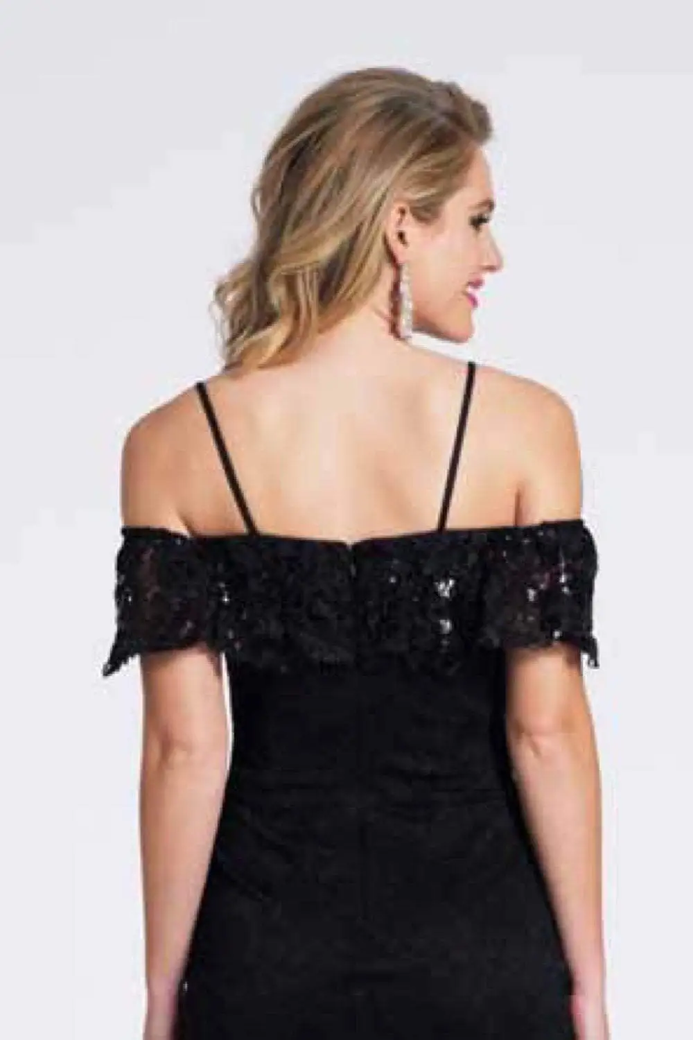 | Details: | Off-shoulder sleeves, Spaghetti straps, Lace, Sequins, Fitted bodice, Sheath skirt, Back zipper |