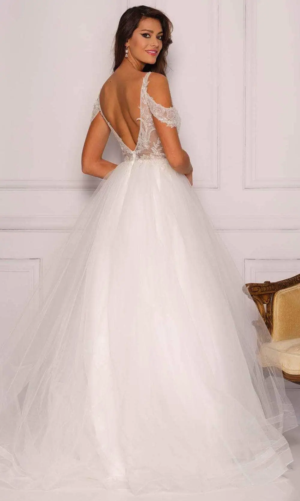 Foster a style that is remarkably feminine when you wear this Dave & Johnny A10488 creation. Displaying a v-shaped neckline over a sweetheart lining that is teamed with supporting sheer straps which lead to an alluring open back. Extra short sleeves drape on the arms creating a cold shoulder style. The skirt reveals a semi-ballgown silhouette with sweeping train finish for added drama. Fall in love when you slip on this Dave & Johnny Bridal creation. Model is wearing the White color.