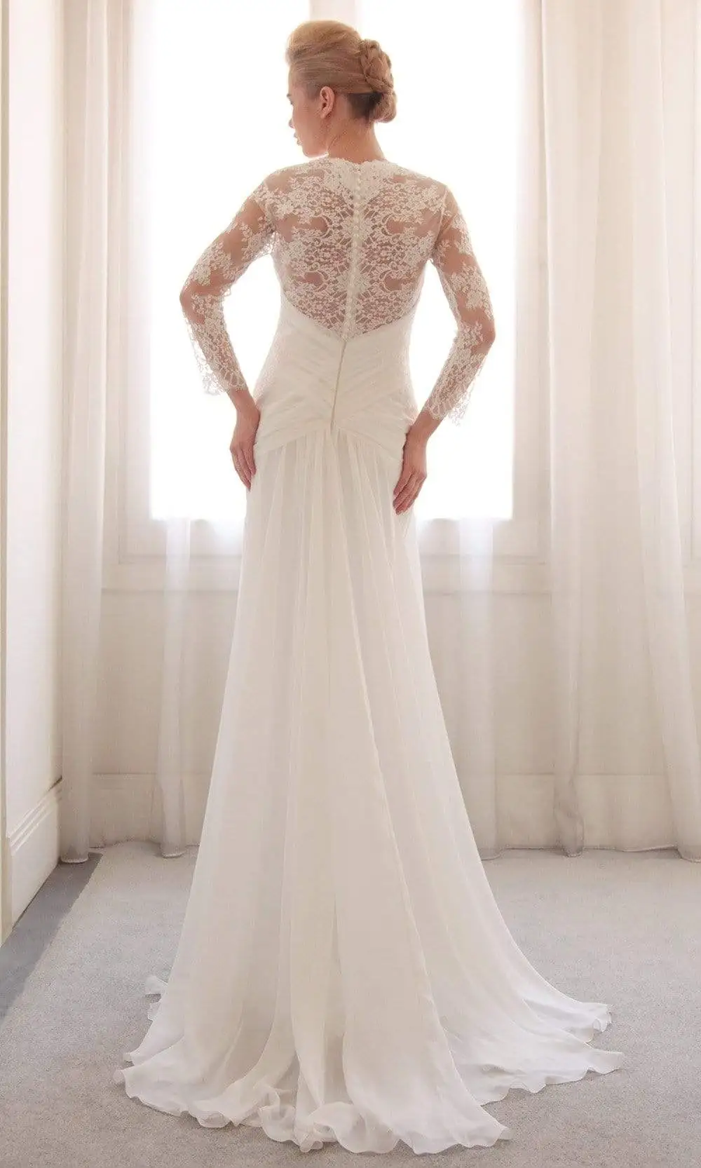 | Details: | Pleated Bodice, Lace Long Sleeves, Floor Length, Buttons, Sweep Train |