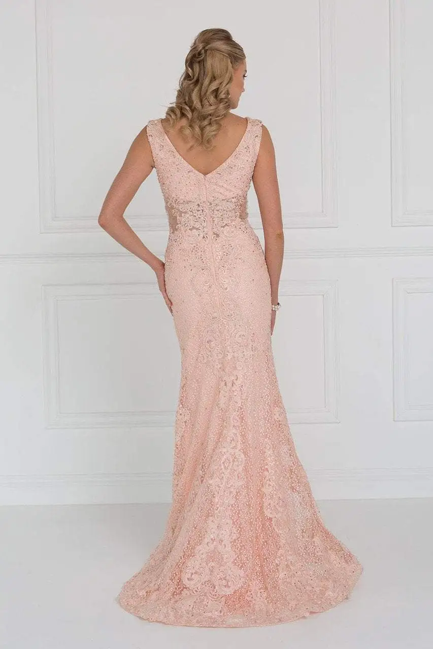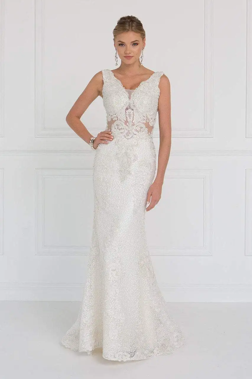 Shine through the night in this mesmerizing Elizabeth K GL1533. The sleeveless bodice features a V-neckline mirrored by a V back. Sheer panel details adorn the neckline, side and center cutouts with bold jewel and beading detail throughout on a solid one tone. This ensemble cascades to the floor finished off with a sweep train. Walk in glamour and defined sophistication in this Elizabeth K creation.