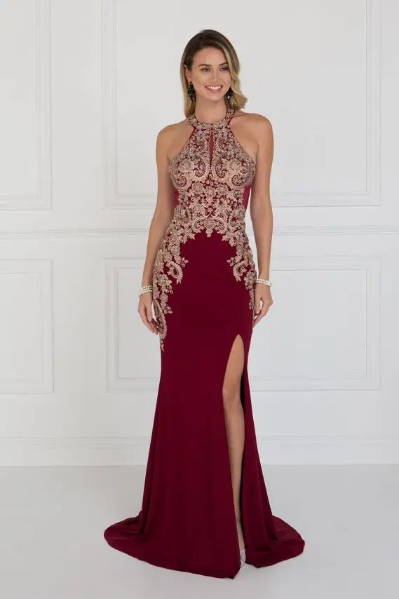 Inspire awe when you walk into your extravagant black-tie event in this purely glamorous Elizabeth K GL1519 creation. Crafted with and elaborate display of gilded lace as a scalloped illusion keyhole panel accents the bust, this chic piece flaunts a high halter neckline framed with cut-in shoulders and sheer curved sections. Gleaming with bejeweled ornaments accenting the racerback detail, a triangular cutout dominates the mid-open back for that touch of allure. Beautifully bordering with appliques in from the waist while highlighting the sides of the hips, the sheath skirt parts with a thigh high slit as it cascades gloriously down to brush the floor with a sweeping train. Rival the sheer luminosity of the starry sky while dancing all night long in this Elizabeth K masterpiece. Models are wearing the Burgundy, Champagne and Navy colors.