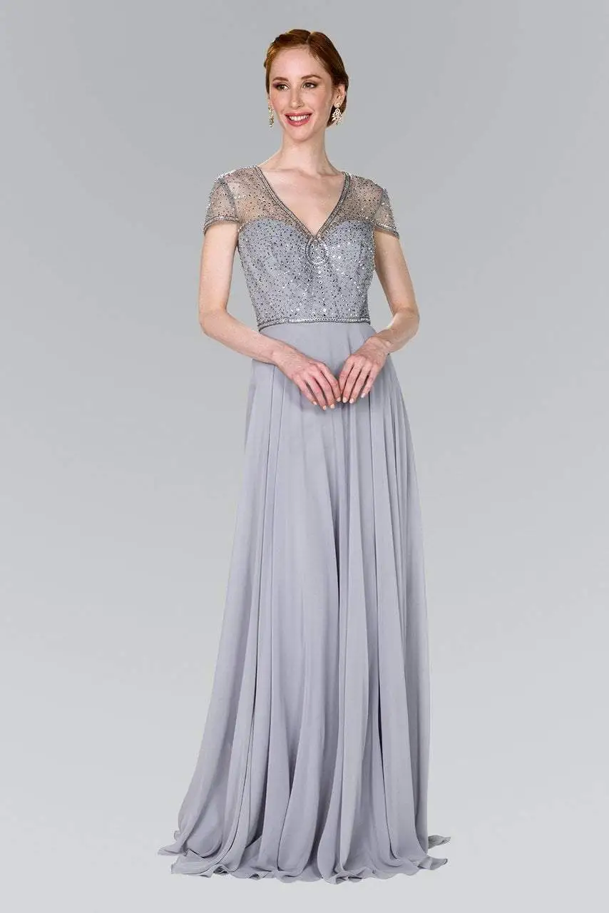 Show off your classy style when you wear this dress by Elizabeth K GL2405. This long formal dress features a V-neckline with sheer short sleeves. The sweetheart lined bodice s embellished with glittering beadwork. The back has a zipper closure while an A-line skirt runs in full length hem with mini train. This Elizabeth K dress definitely parades the elegant and classy style.