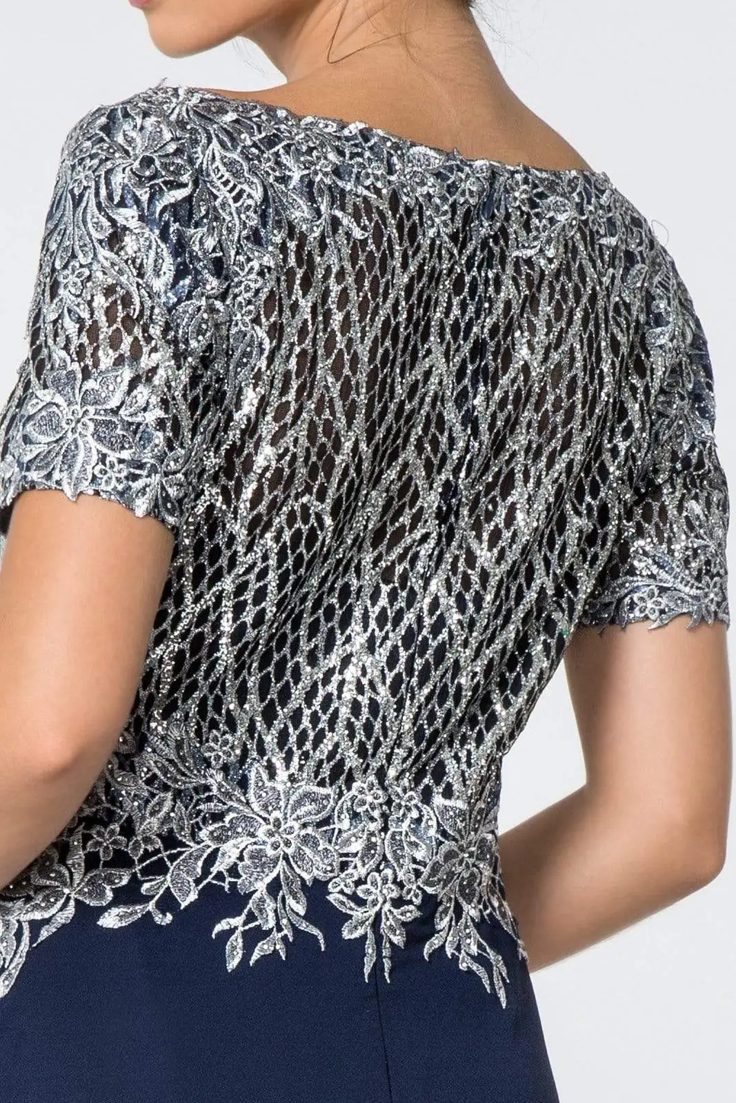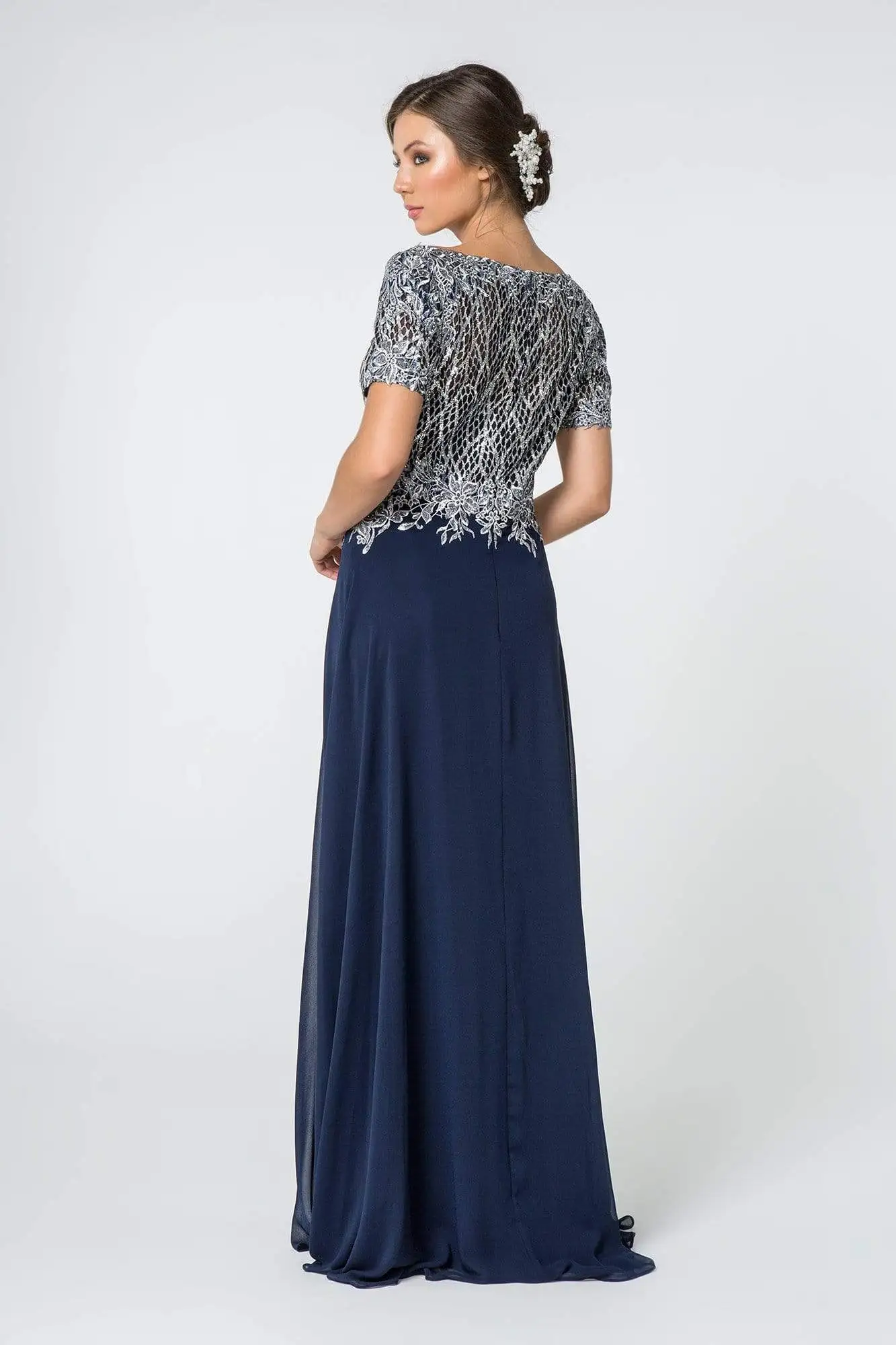 Lavish in the mesmerizing elegance of this Elizabeth K GL2826 creation. Twinkling with an exquisite metallic embroidered lace, this ensemble flatters with an illusion bateau over a plunging lining. The back is sewn in with embroidery as it short sleeves shows a sheer quality. Soft chiffon cascades to the floor with a subtle train. Indulge in the sophistication brought by the Elizabeth K masterpiece.