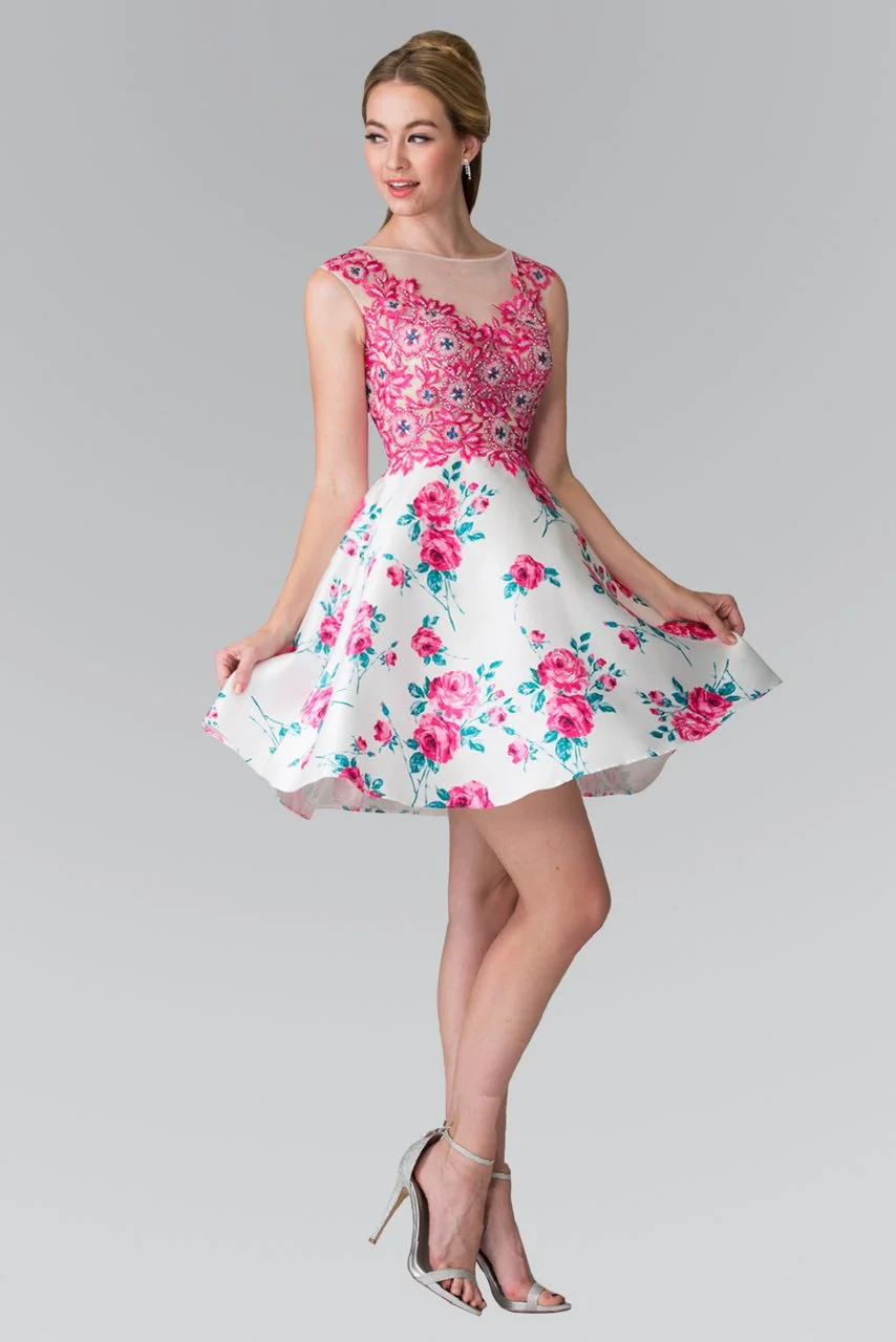 Get ready for everyone to stop and stare when you show up in this cocktail dress by Elizabeth K GS1445. Bateau neckline of sheer fabric structures this beautiful evening dress. Beaded embellishments fashioned the straps and framed the keyhole detail at the back. Floral prints dispersed all over the short skirt for a prettier look. This Elizabeth K creation is truly remarkable!