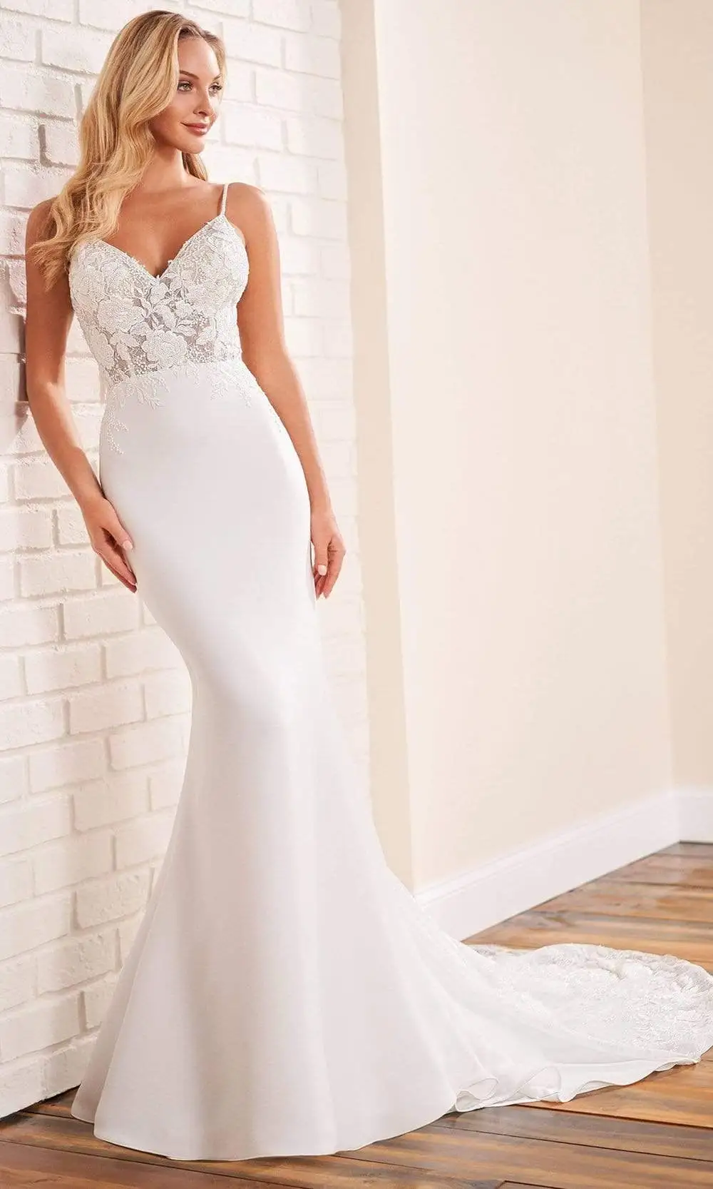 Take your seat on the throne in a queenly gown from Enchanting by Mon Cheri 221163. This beautiful long dress flatters your figure in all angle. It uses crepe fabric and lace as well. Bodice is designed with rosette details in embroidery and then uses corset. It presents using spaghetti straps and V neckline. It goes with a fit and flare trumpet silhouette to give you better shape. From head to toe, you look gorgeous in a detailed gown from Enchanting by Mon Cheri.