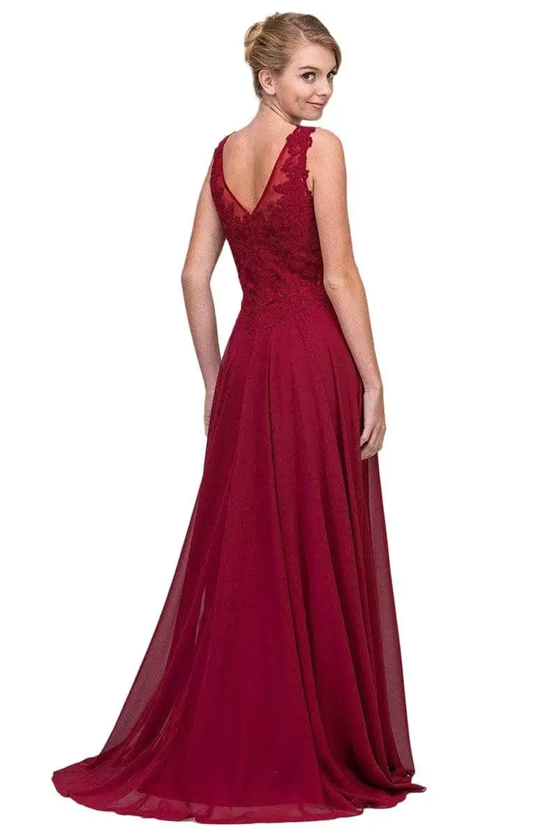 Surround yourself with decadence in a dazzling dress from Eureka Fashion 4711. Graces a sleeveless, scoop neckline with fitted bodice ornate with appliques. The back has a V-cut while the chiffon skirt opens in a full length A-line silhouette with a sweep train finish. Leave a trail of admirers as you glisten in beauty in this Eureka Fashion masterpiece.
