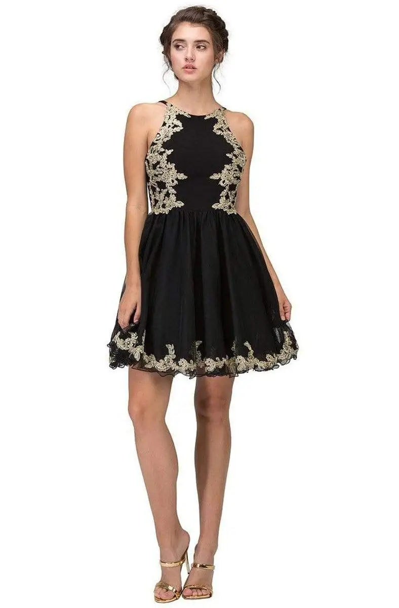 Looking for a chic party dress? Here is for you, Eureka Fashion 6026 cocktail dress. This trendy short dress showcases a sleeveless bodice with a halter neckline and mid-open zipped up back. Gold leaf appliques beautify the top and hemline of the pleated a-line skirt which graces to the mid-thighs. This Eureka Fashion ensemble is truly a definition of glamour.