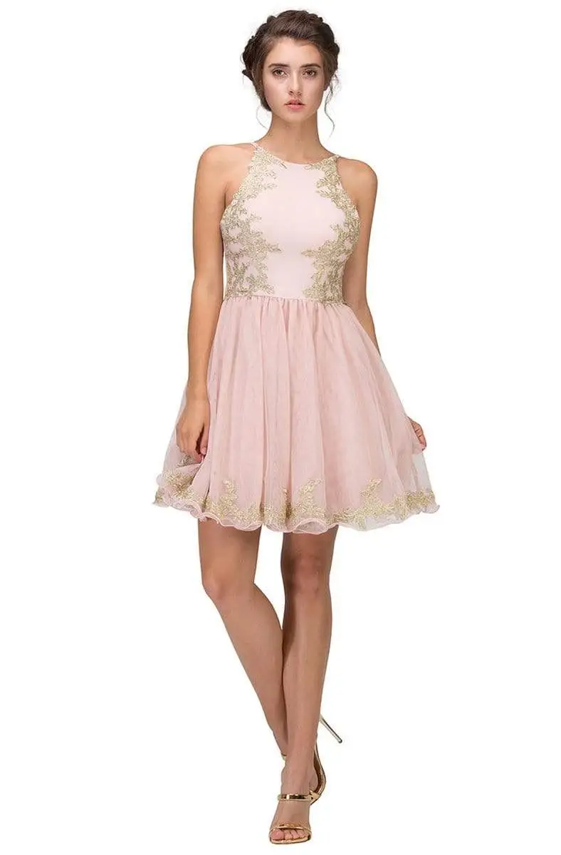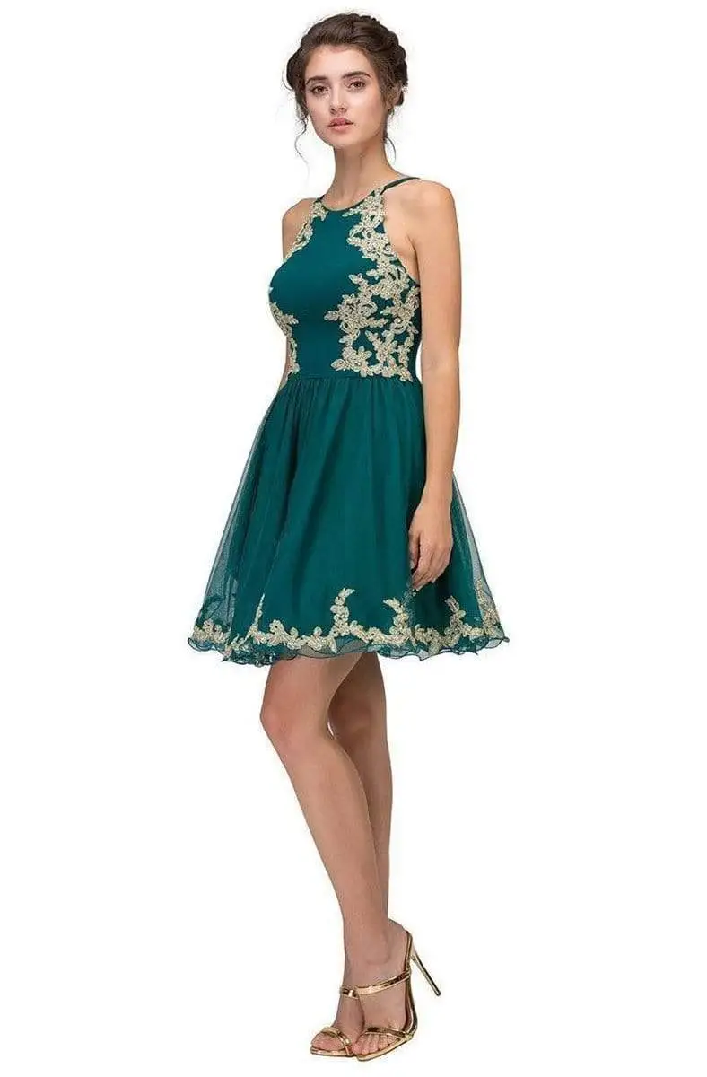 | Details: | Gold Leaf Appliques, Fitted, Spaghetti Straps, Pleated Skirt, Mid-Thigh Length, Mid-Open Back, Back Zipper Closure |