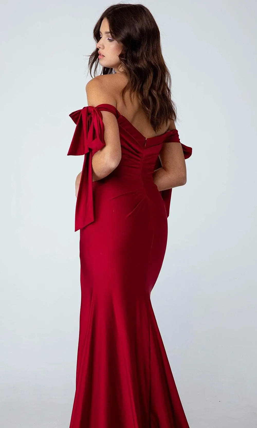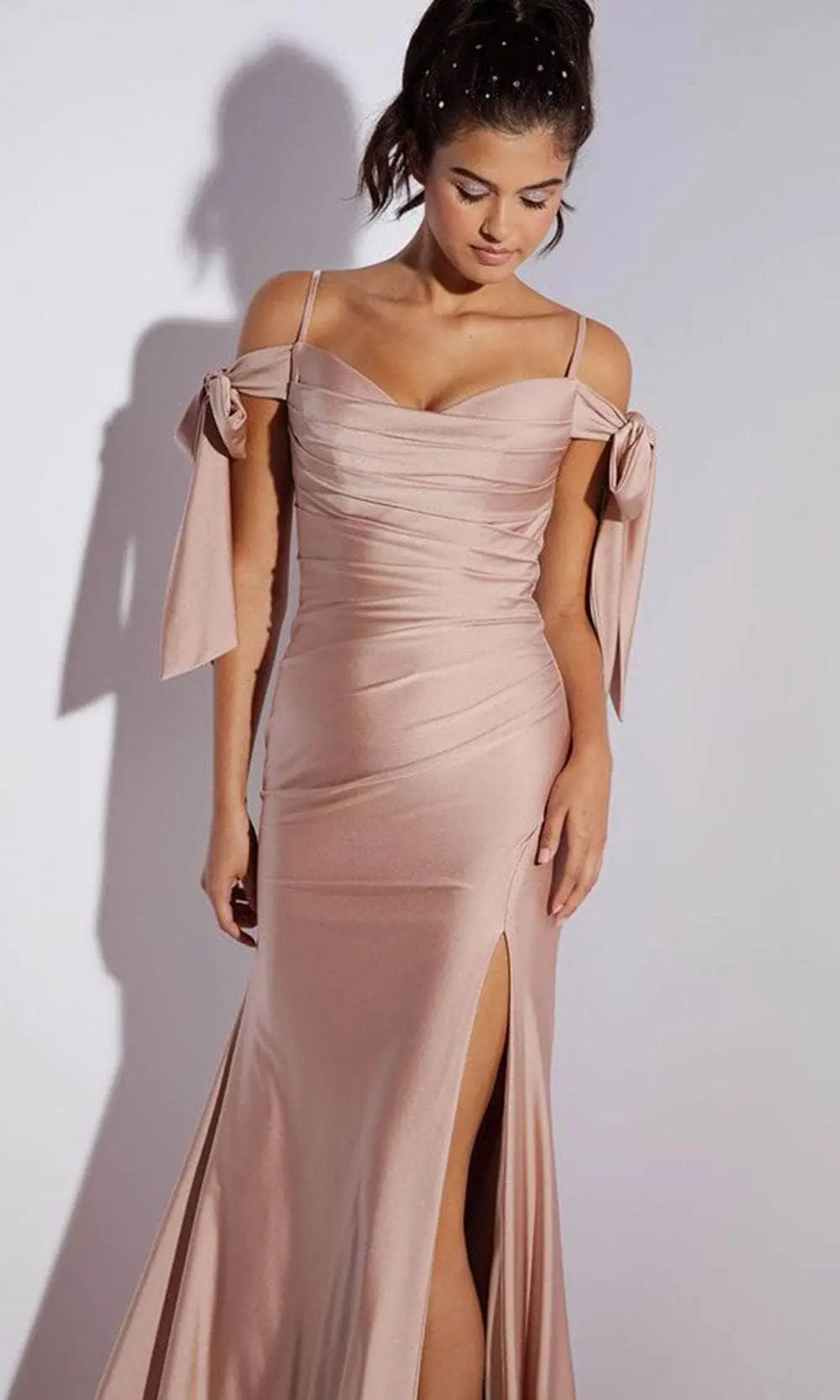 | Details: | Off-Shoulder, Ruched Bodice, Bow Tie Sleeves, Slit, Back Zipper Closure |