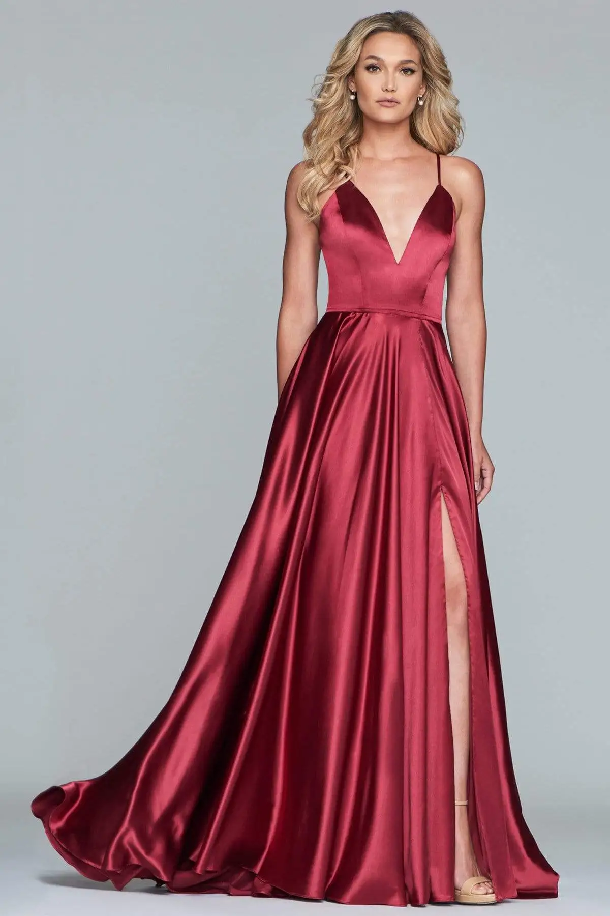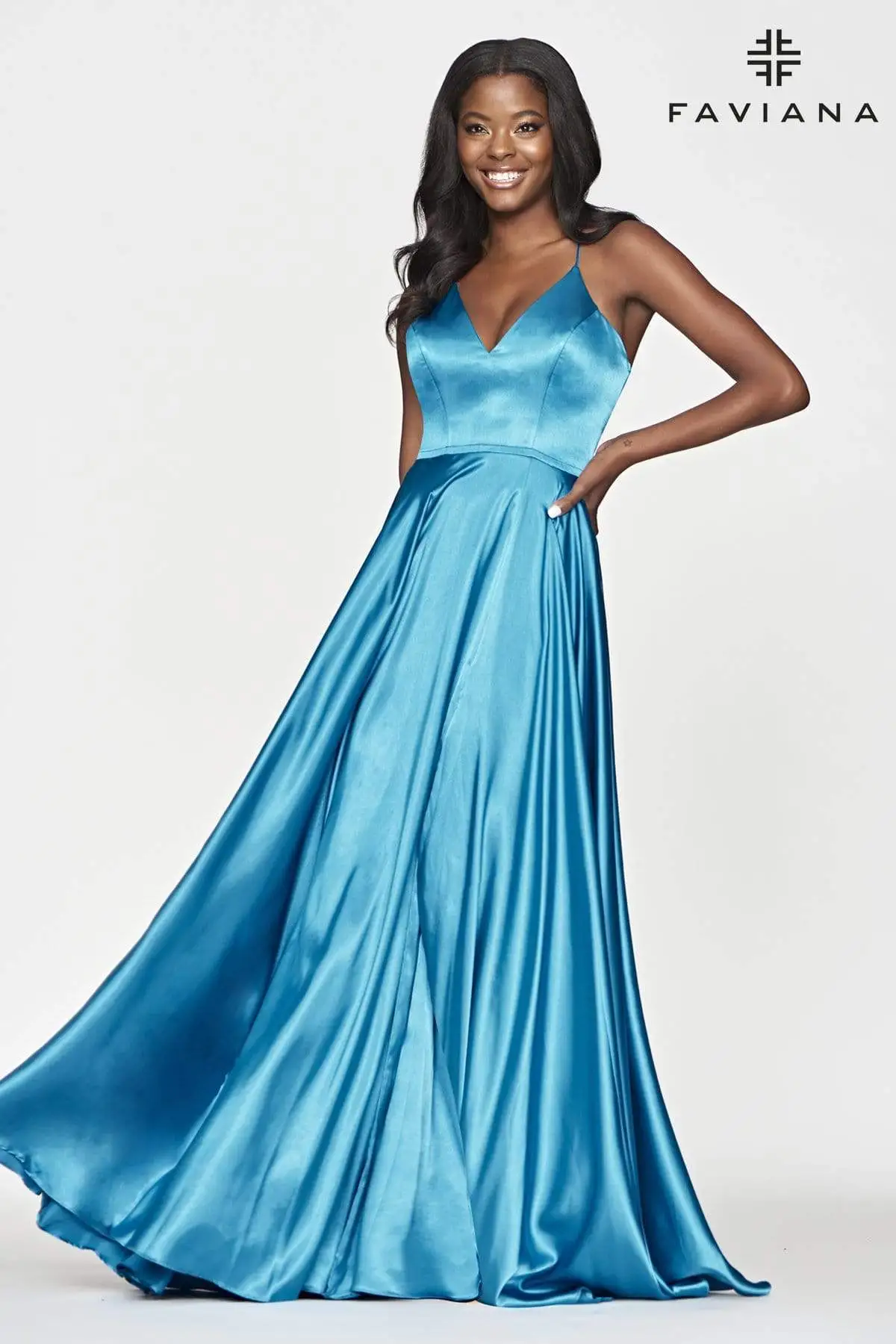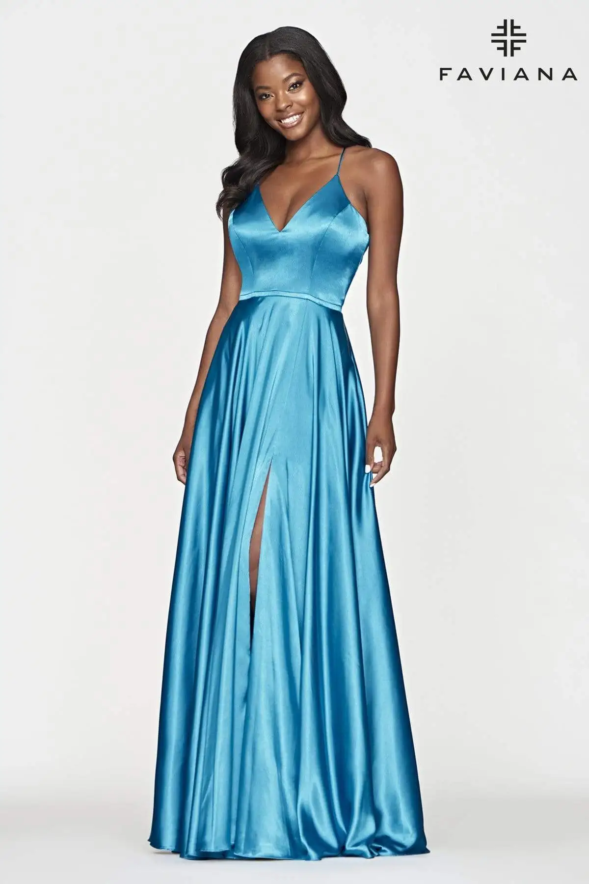 Steal the show in Faviana S10209 Evening dress. Beautifully crafted in the lightweight satiny weave of Charmeuse fabric, this long and sleeveless dress features a plunging V neckline with spaghetti shoulder straps. The low-cut back allures with lace-up details for an adjustable fit with zipper closure. The full-length skirt features side hand pockets and a side slit and finishes at floor length with a sweep train. This Faviana creation is the perfect match for the girl who wants to look both sexy and fashion-forward.