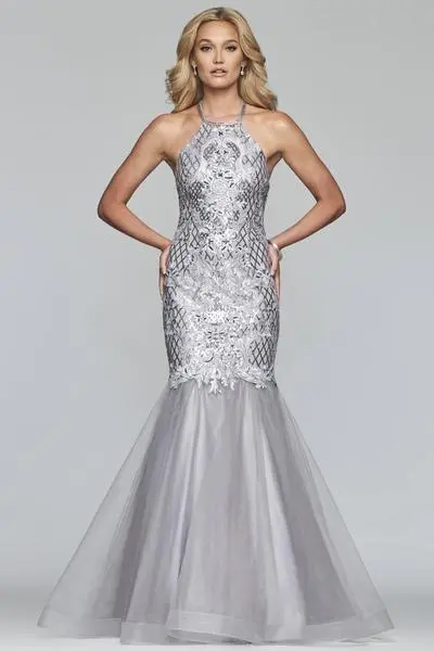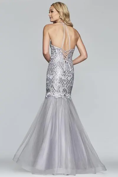 Join us in celebrating your beauty in a sophisticated masterpiece from Faviana S10221. The fitted bodice is exquisitely embroidered adorned with stunning sequins and features a halter neckline. Tailored in tulle, the skirt offers a mermaid silhouette and ripples in pleats to full length finished with horsehair hem. The back is mid-open with lace up closure detail. Feel gorgeous when you walk into the party wearing this Faviana evening gown.