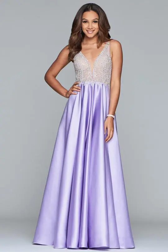 Get ready for everyone to stop and stare when you show up in this unique gown from Faviana S10291. Fashions a sleeveless, deep V-neckline with sheer fitted bodice embellished with beading. The gown has a lace up closure for an adjustable fit and flourishes a satin ballgown skirt. This enchanting Favianasure to make you the center of everyone’s attention. Model is wearing Lilac color.