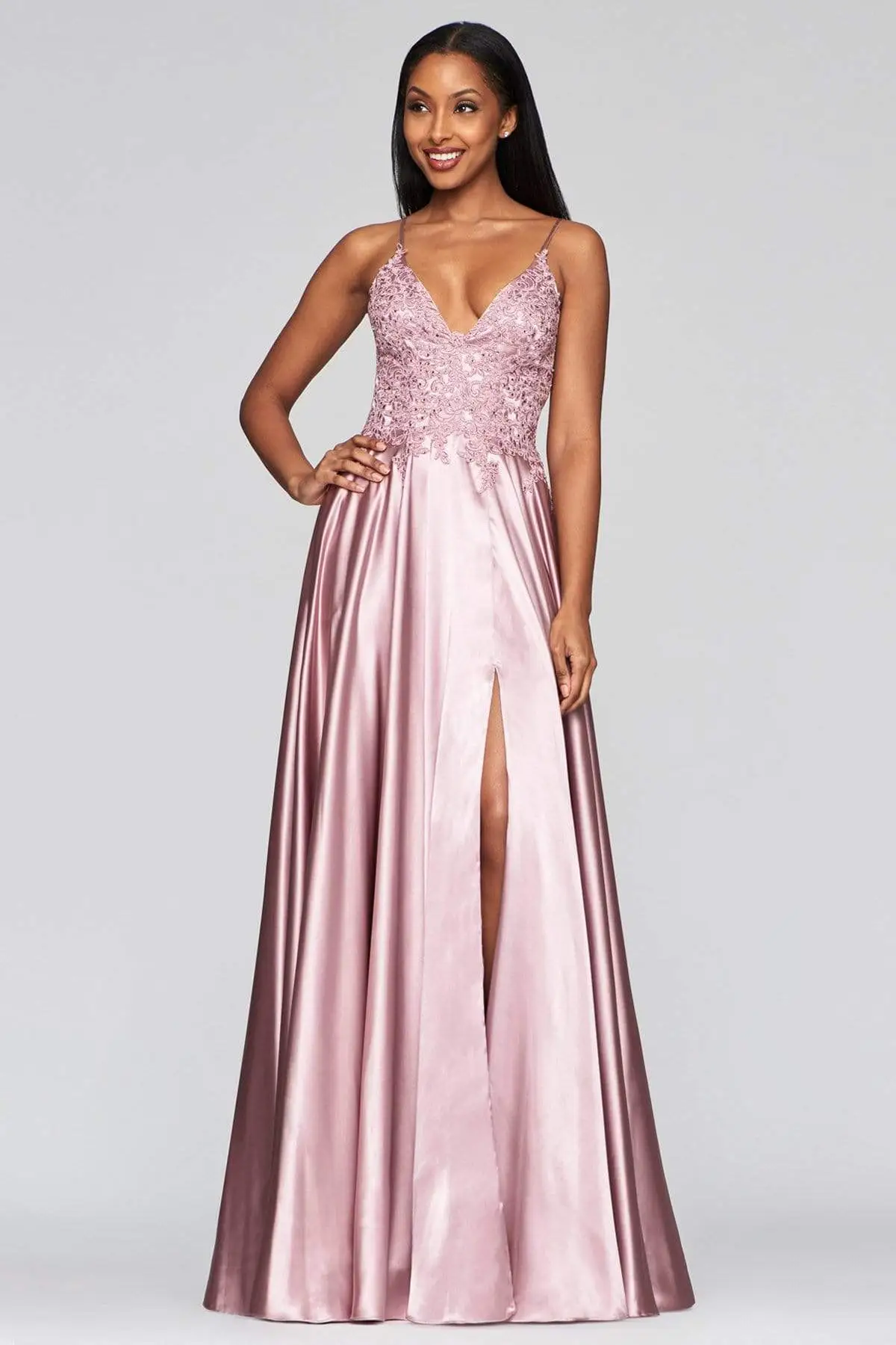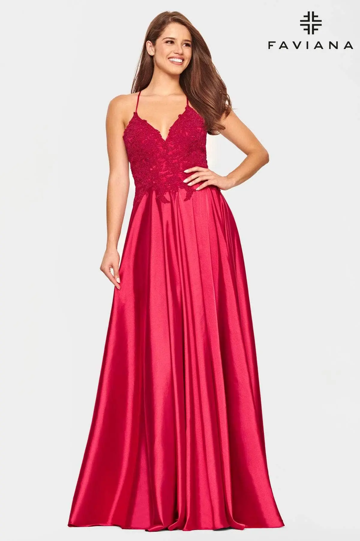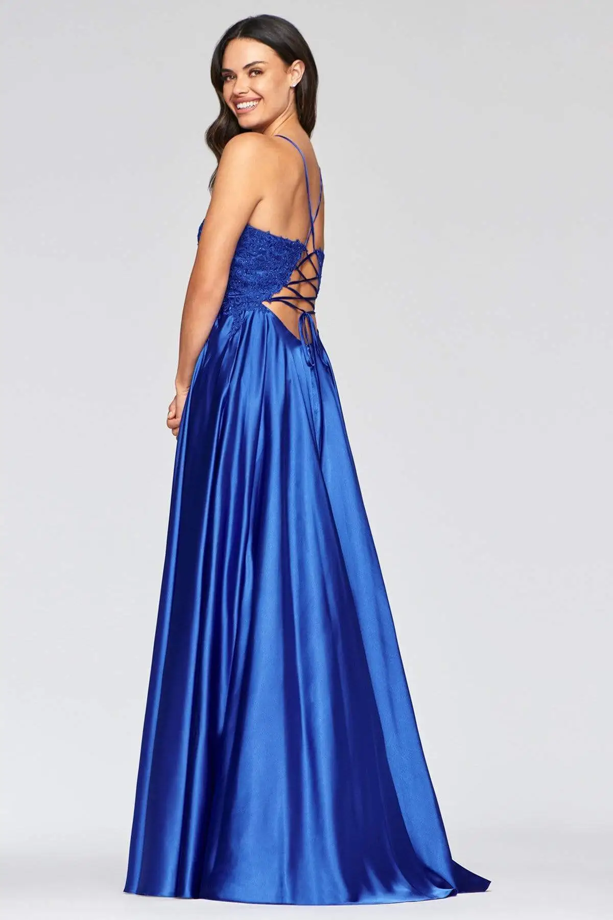 Captivate everyone in this charming look by Faviana S10400 . Mesmerizes in a sleeveless, beaded lace embellished bodice framed in a V-neckline with spaghetti straps. The back has a lace-up closure while the vibrant satin skirt flares a grandiose A-line silhouette with thigh-high front slit. Claim that queenly look on this years Prom wearing this Faviana creation. Models are pictured wearing the colors: Royal, Deep Green, Deep Mauve, and Red.