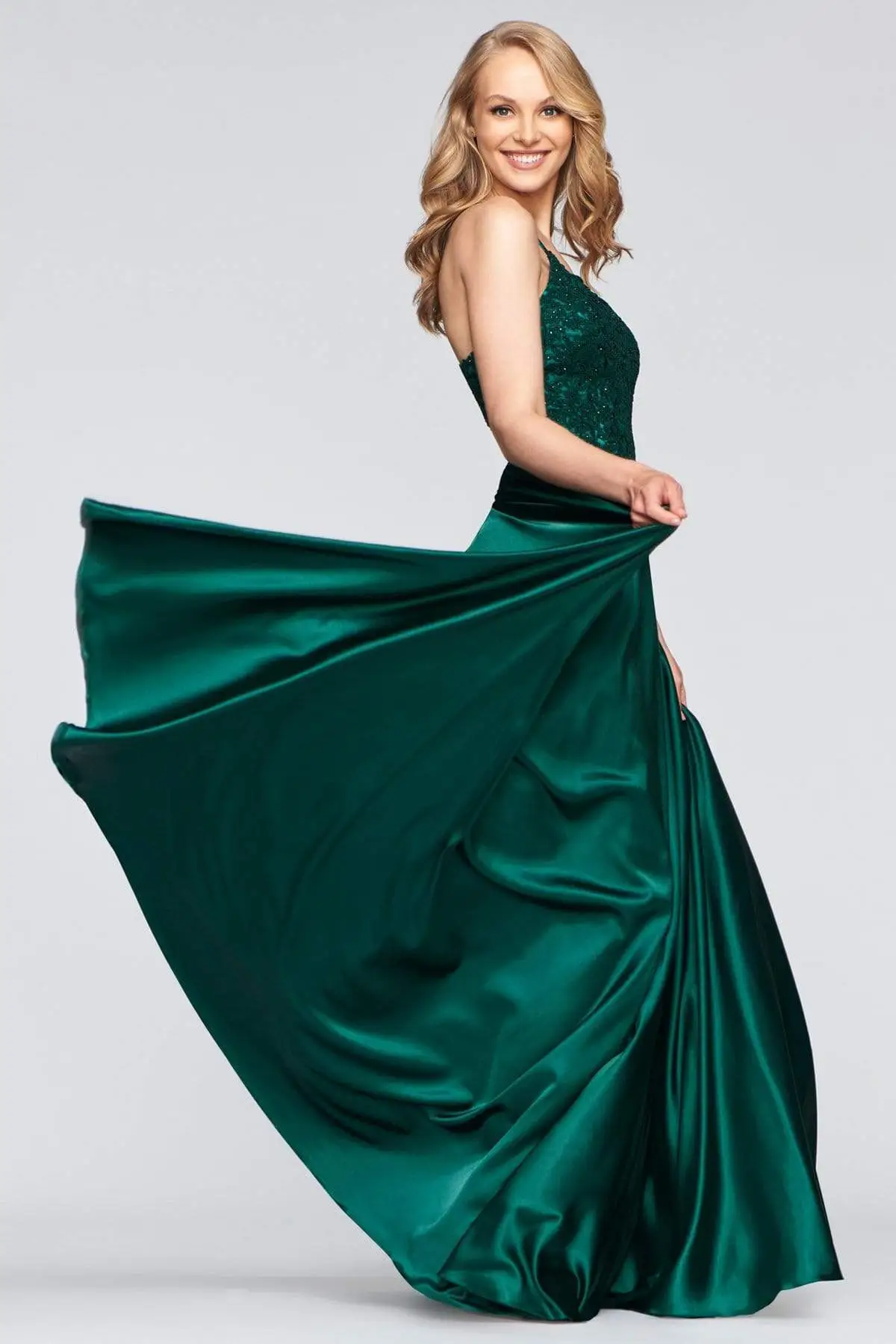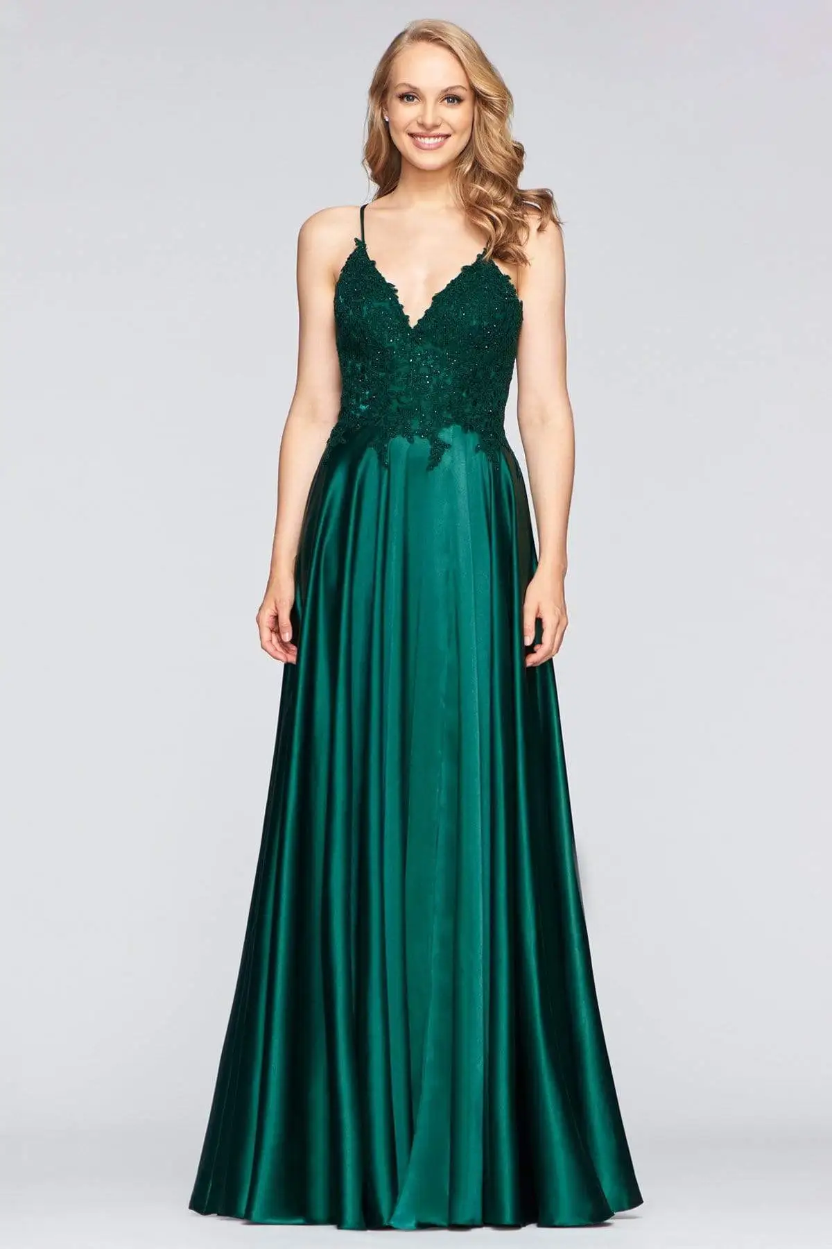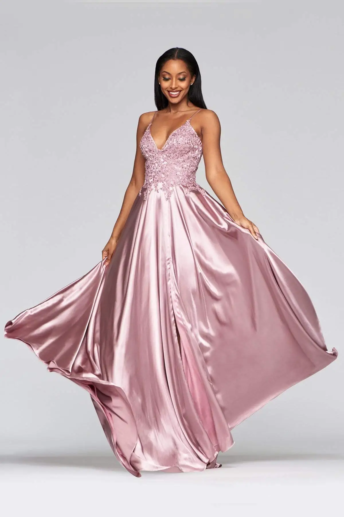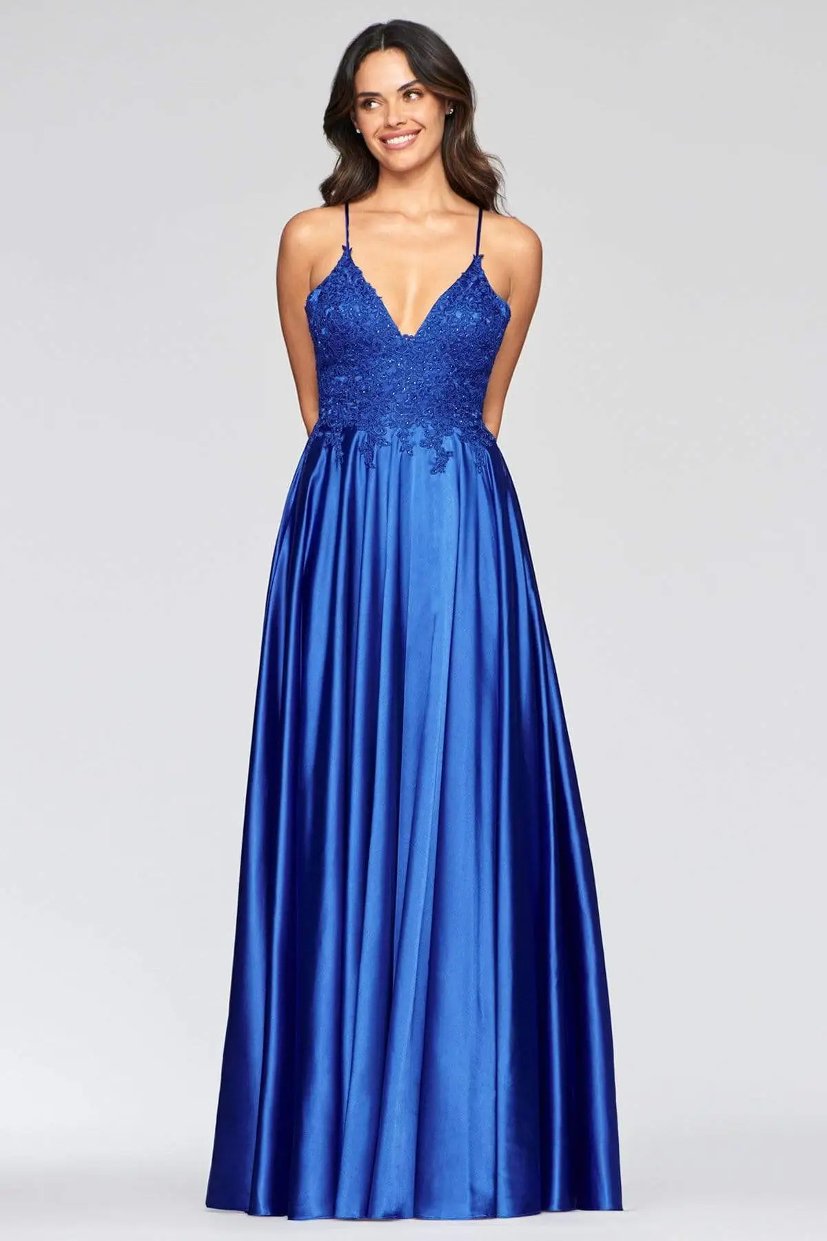 Captivate everyone in this charming look by Faviana S10400 . Mesmerizes in a sleeveless, beaded lace embellished bodice framed in a V-neckline with spaghetti straps. The back has a lace-up closure while the vibrant satin skirt flares a grandiose A-line silhouette with thigh-high front slit. Claim that queenly look on this years Prom wearing this Faviana creation. Models are pictured wearing the colors: Royal, Deep Green, Deep Mauve, and Red.