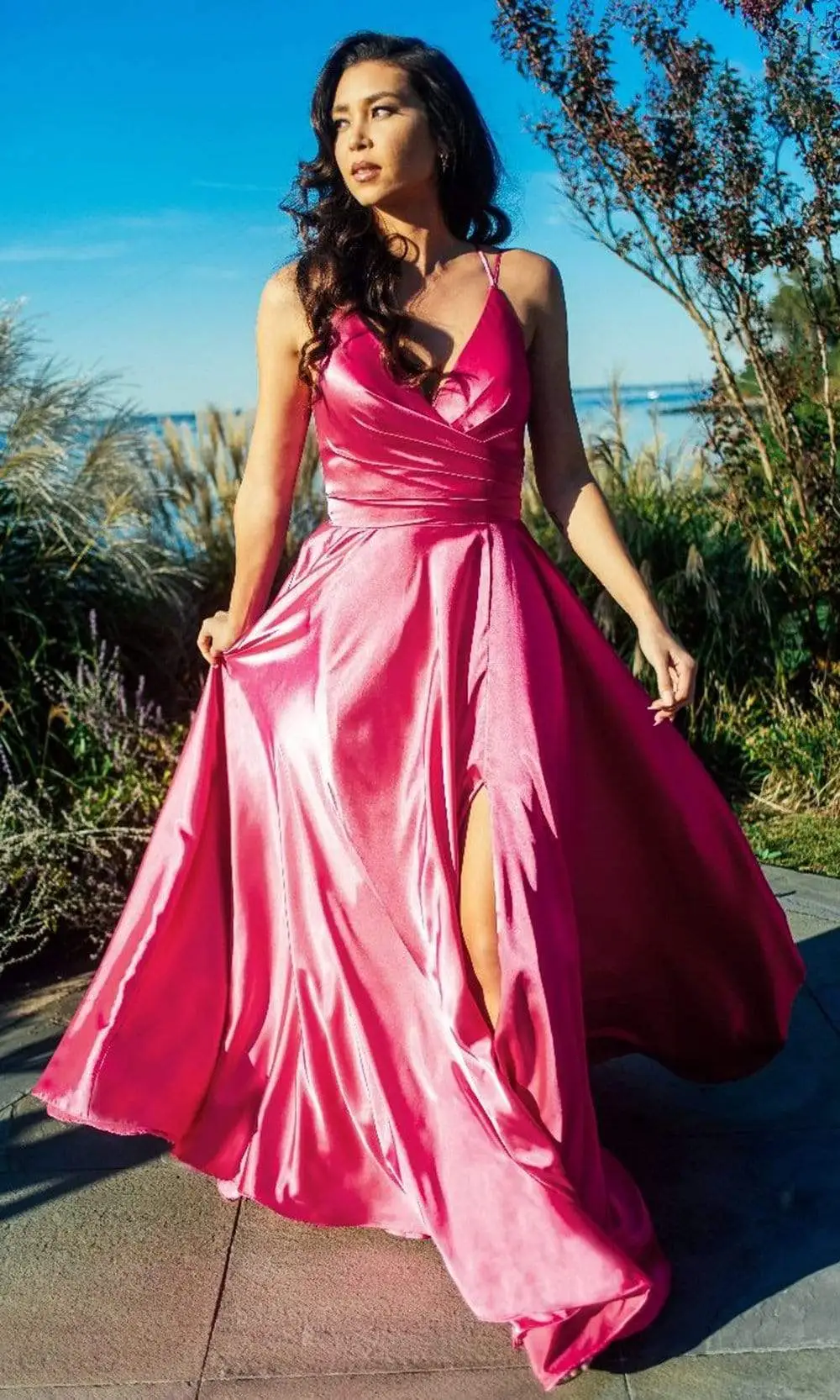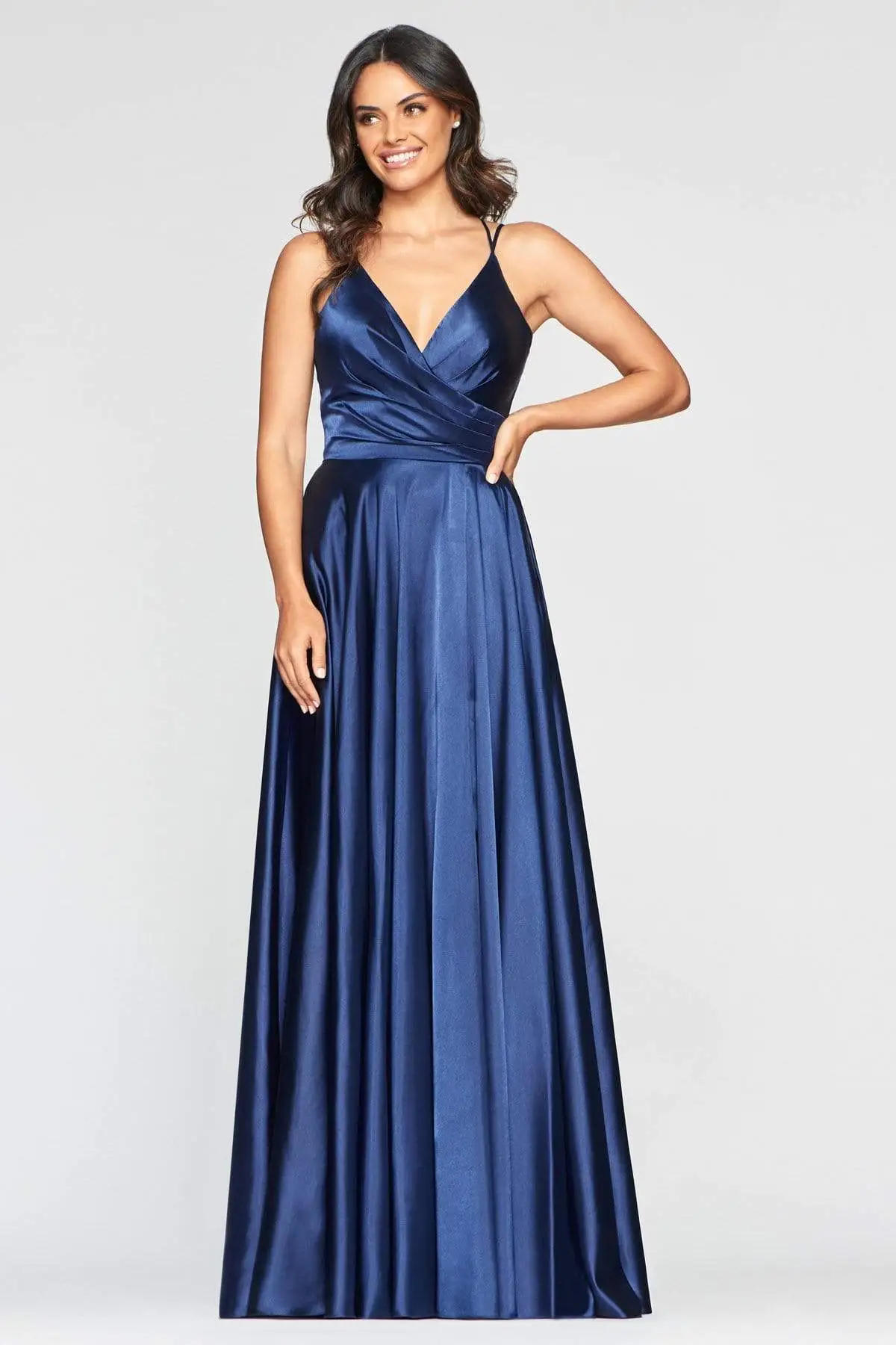 Dress yourself in elegance from top to toe with this evening gown by Faviana S10429. This long charmeuse satin gown flaunts a sleeveless top with pleated faux surplice style bodice and a deep V neckline with double fine shoulder straps. The back is bare at the center with lace-up strappy details securing an adjustable fit to the bodice. Closely spaced pleats debut the full-length skirt, which fans to soft flutters at a fabulous full-length. Feminine, bold, and imperial, this gown from Faviana will definitely make you shine! Model is wearing Navy color.
