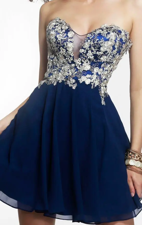 | Details: | Strapless Low Sweetheart Neckline with Mesh Inserts, Embroidered Bodice, Mesh Overlaid Low Open Back, Thigh Length, A Line Chiffon Skirt |
