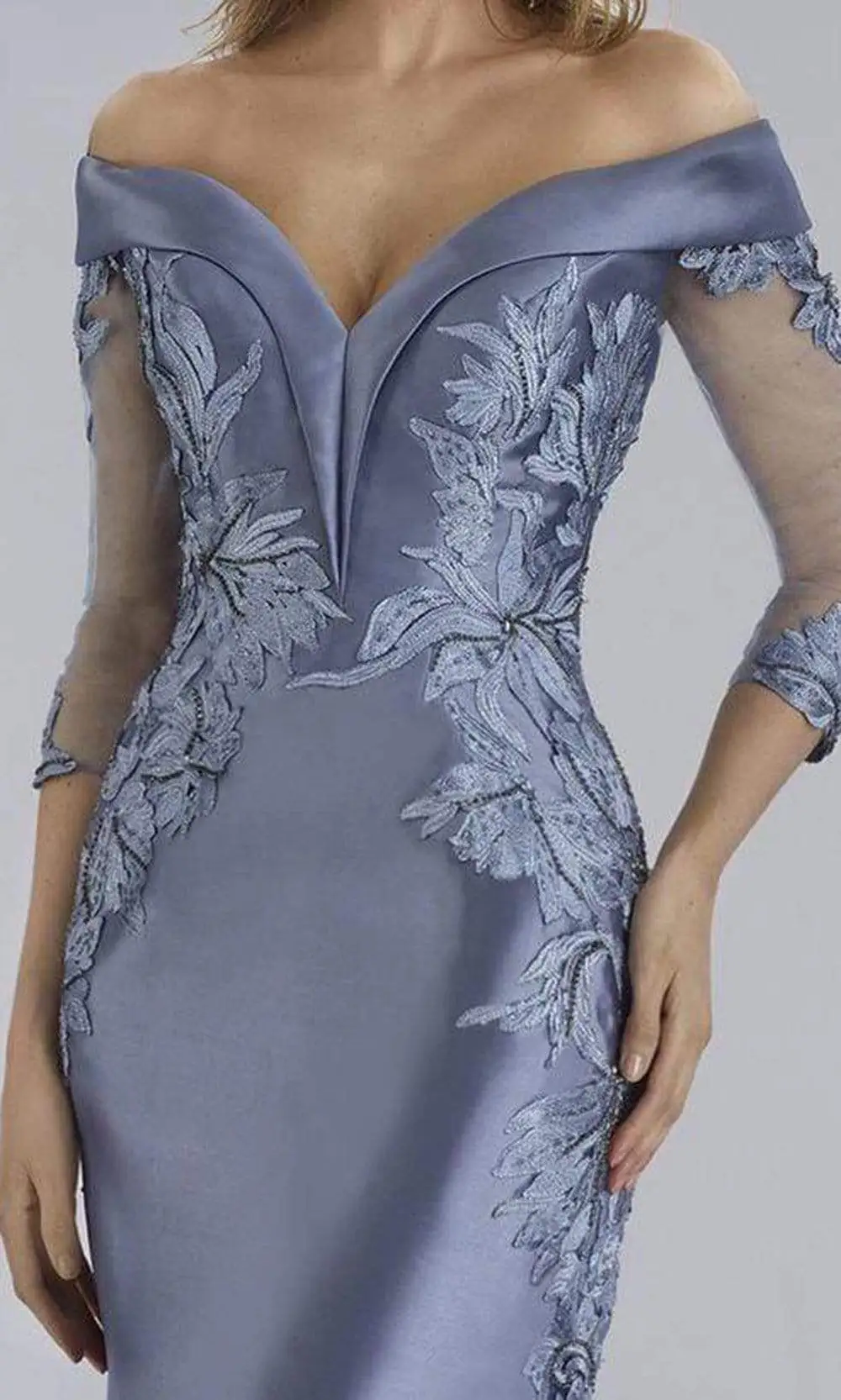 Get glamorous look with this creation by Feriani Couture 18971. This long dress graces in a plunging off-shoulder neckline with sheer quarter length sleeves. It has a form-fitting bodice with embroidery at the sides and cascades to the skirt. The skirt forms a trumpet silhouette and finishes in a sweep train. This Feriani Couture dress is an absolute breathtaking look. Model is wearing Blue color.