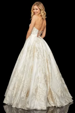 | Details: | Plunging neckline, Sheer quarter length sleeves, Fitted bodice, Embroidery, Trumpet skirt, Sweep train, Back zipper |