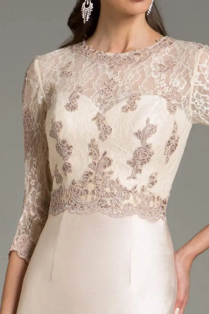 Floral lace design graces the bodice and sheer three-quarter length sleeves of this dress. A refined jewel neckline edged the sheer lace yoke as the back features a long keyhole. The skirt at above the knee- hemline with a modest slit. Model is wearing the Champagne color.