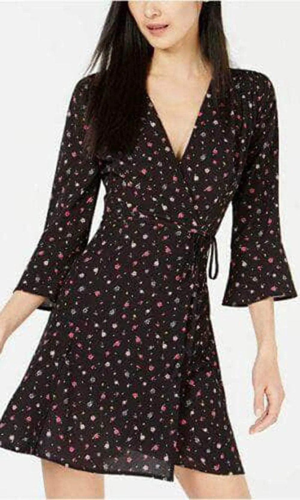 | Details: | Bell Quarter Sleeve, Faux Wrap Bodice, Floral Print, Pleated, Tie Waist, Full Back, Mid-Thigh Length |