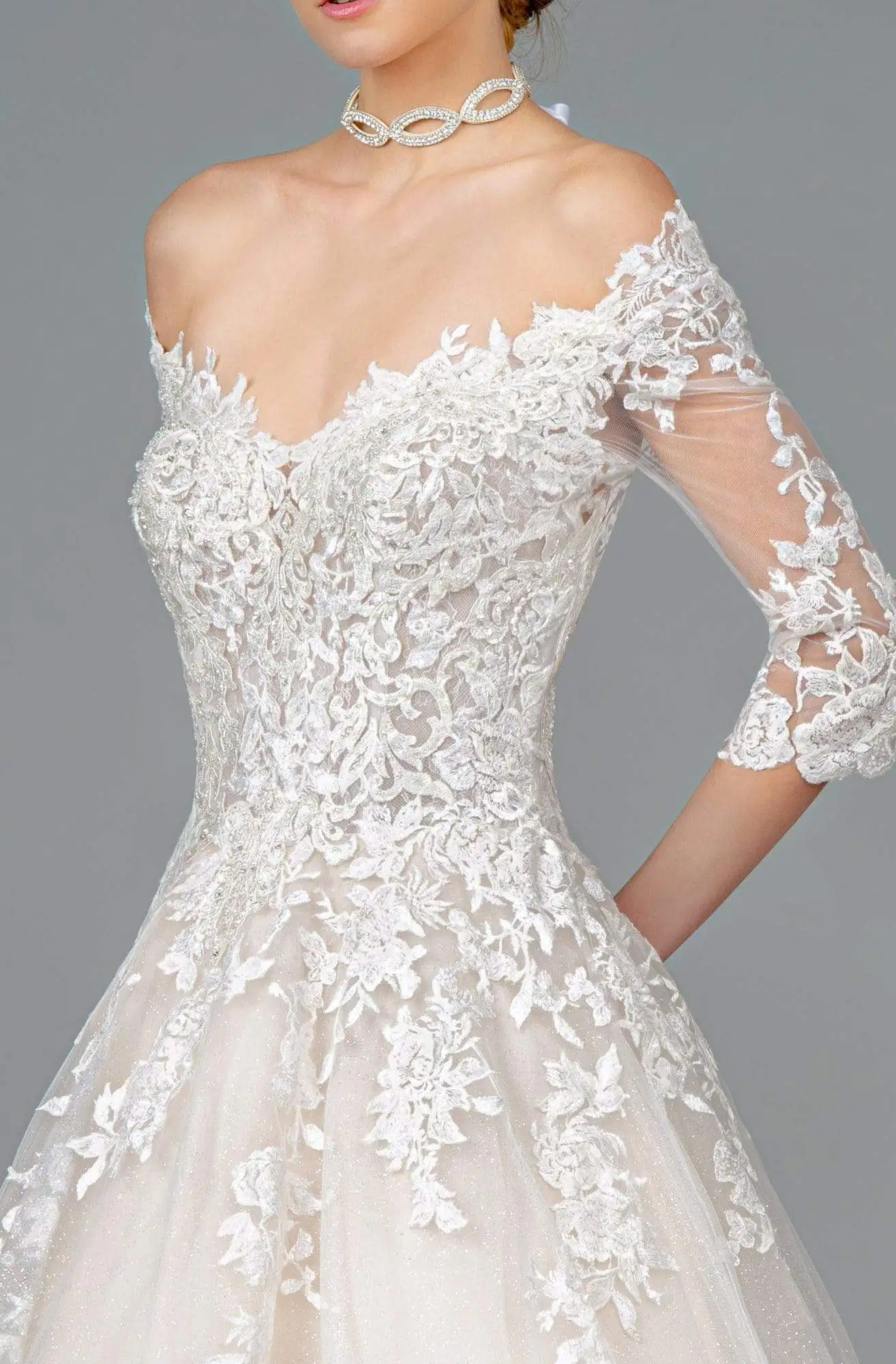 Be the spectacular belle in GLS by Gloria GL1803. This embroidered gown fashions an off the shoulder neckline with quarter length sleeves. The fitted bodice has a sheer back and back buttons. The skirt opens in a full length A-line silhouette with a train finish. This GLS by Gloria design exudes timeless, effortless elegance.